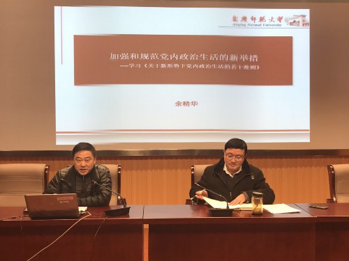 12月21日,beat365在线唯一官网党总支举行学习贯彻党的是十八届六中全会精神专题报告会,马克思主义学院党总支书记余精华教授作了《加强和规范党内政治生活的新举措》宣讲报告。beat365在线唯一官网全体教职员工、第54期入党积极分子培训班学员参加了报告会。报告会由beat365在线唯一官网党总支书记、院长郝涂根主持。