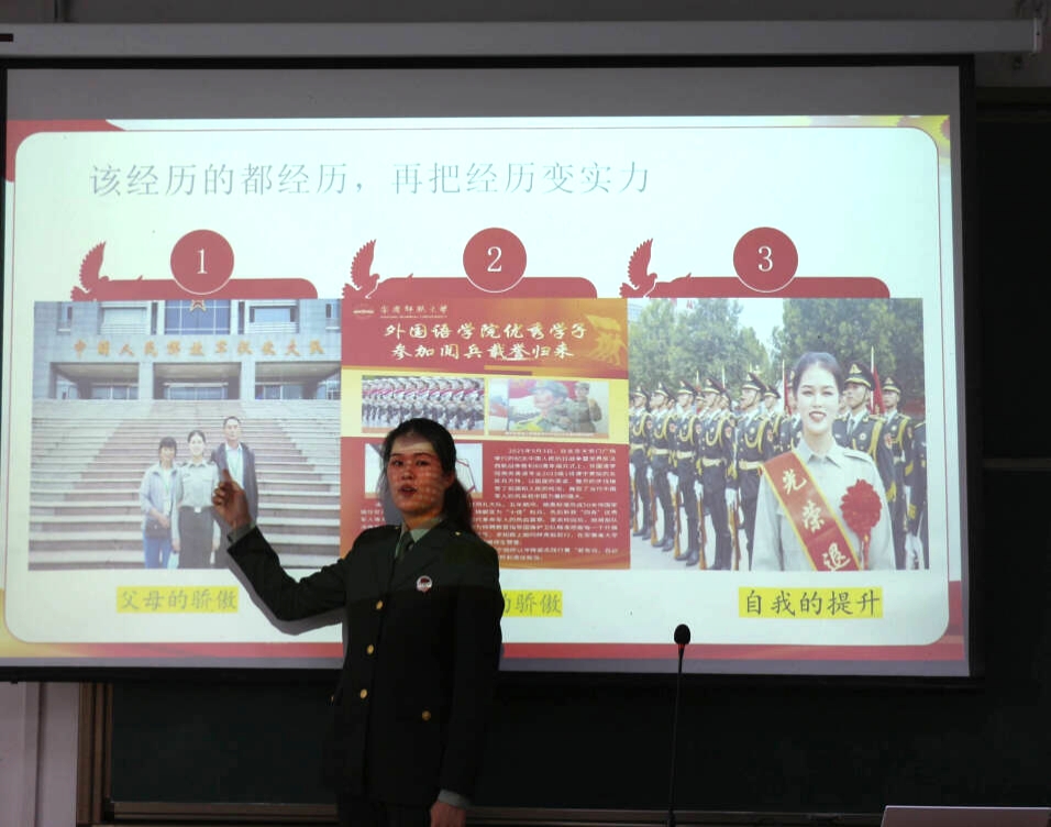 beat365在线唯一官网退役大学生谭宁则结合自身五年的服役经历,以及参加纪念中国人民抗日战争暨世界反法西斯战争胜利80周年阅兵仪式的收获和感悟,生动诠释了“强国复兴有我,青春献给祖国”的豪情壮志。她鼓励同学们积极投身军营磨砺个人品质,体验青春与国家发展共同跳动的美好,进一步增强了国防教育的感染力和号召力。