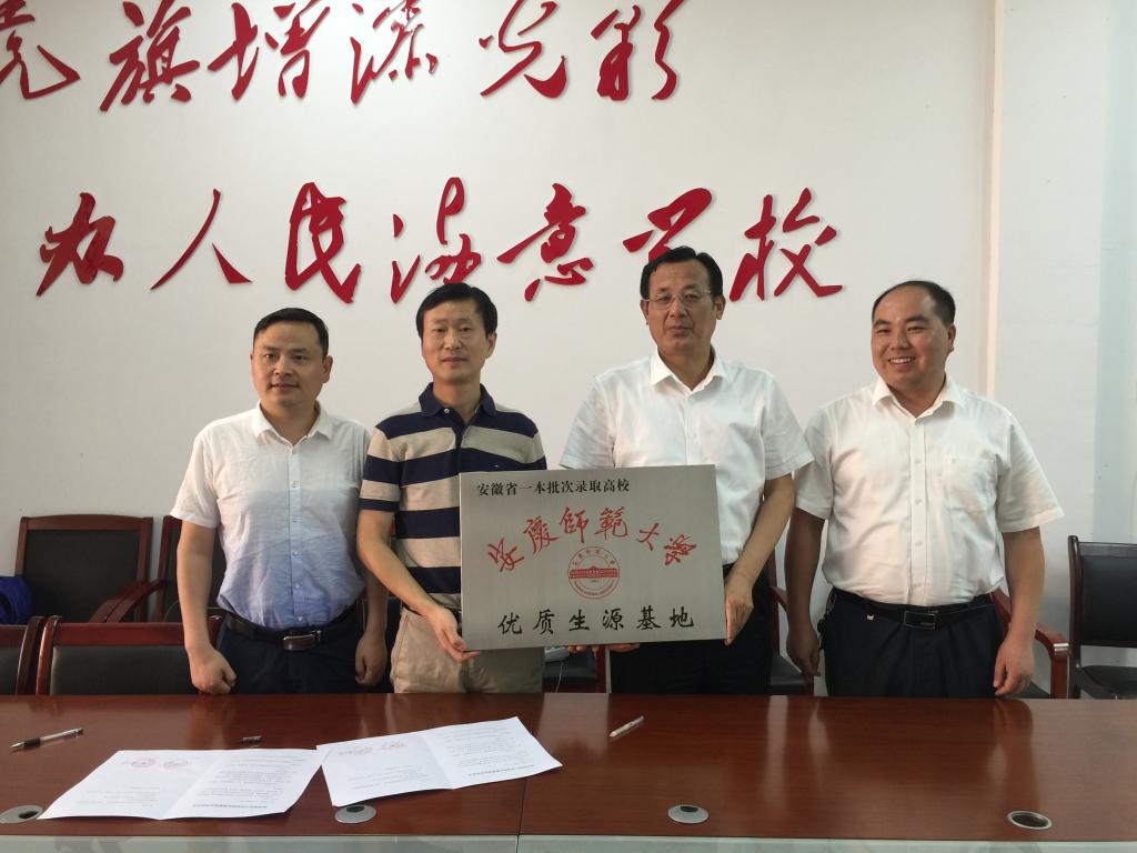 招生宣传组一行先后拜访了蚌埠三中、怀远一中、固镇中学、固镇毛坦厂实验中学、凤阳三中等学校,向各中学校长、年级主任、高三班主任介绍了我校历史沿革、办学特色、招生就业等情况,并就我校招生录取政策、人才培养等方面进行探讨。在达成继续深化合作意向的基础上,我校授予固镇毛坦厂实验中学“beat365在线唯一官网优质生源基地”称号。