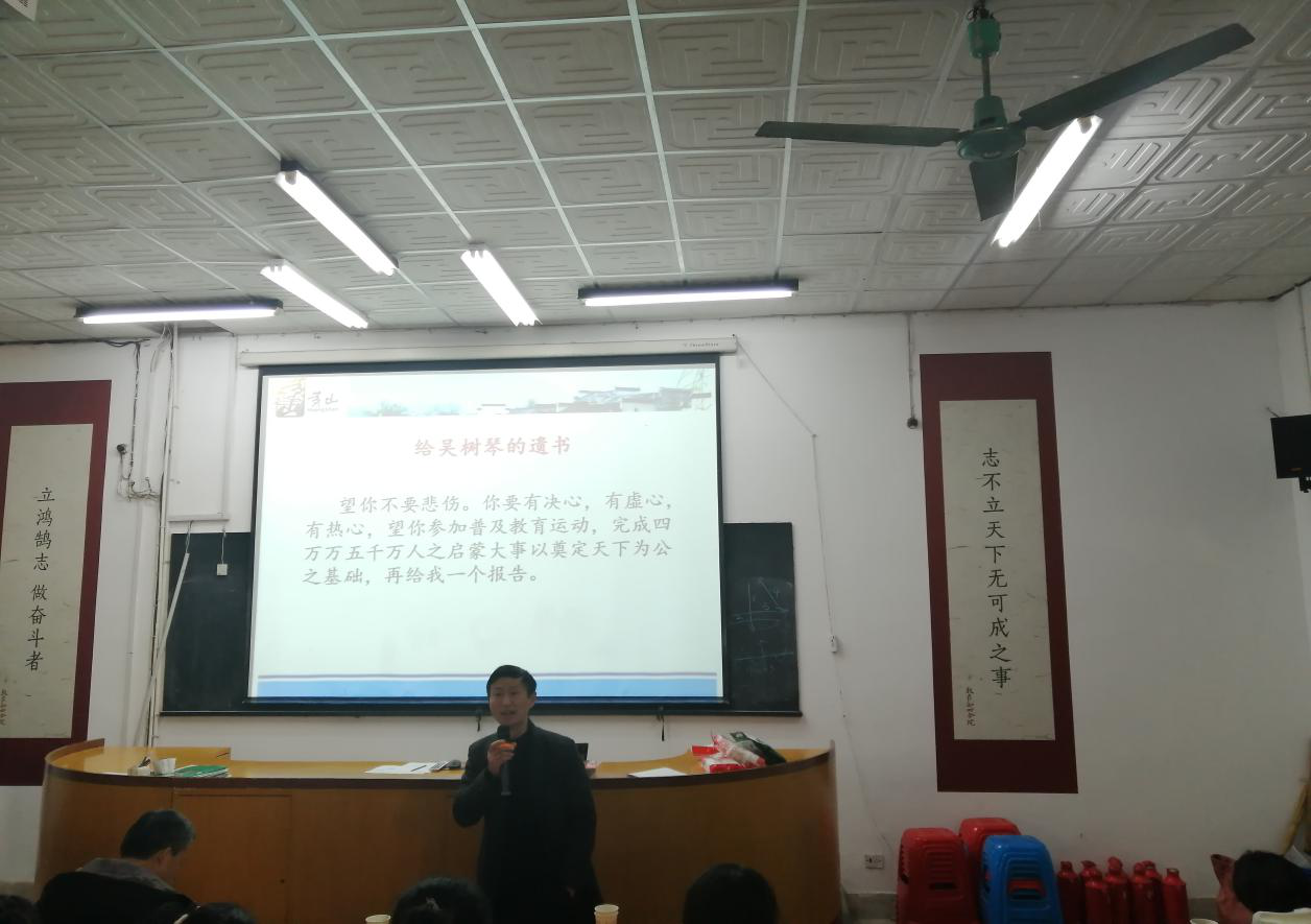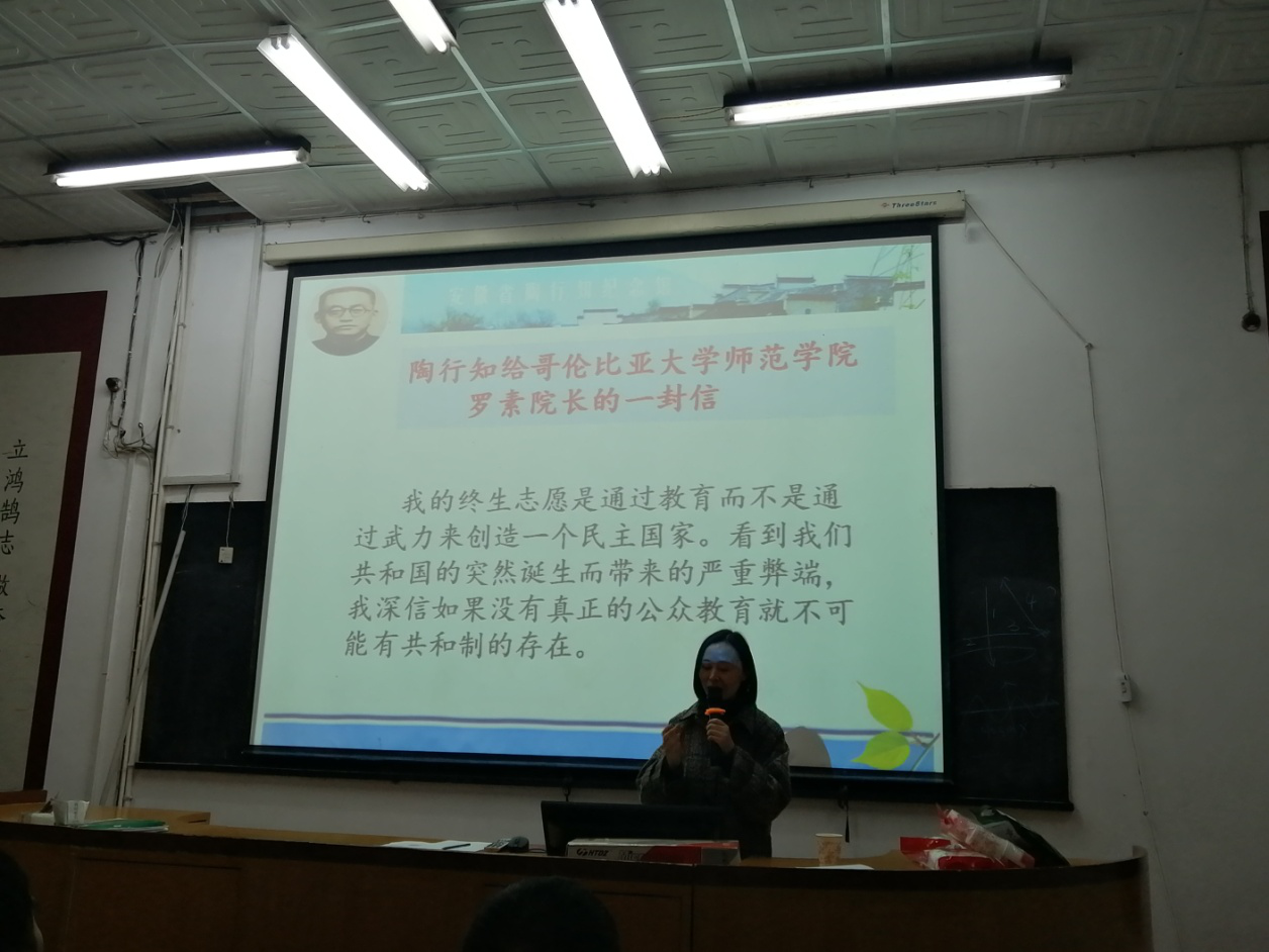 汪勤老师作了陶行知思想教育讲座,对陶行知先生的生平和业绩从青少年、初期教育实践、倡导普及教育、推行国难教育、实施战时教育和提倡民主教育六个时期做了详细的介绍;阐述了其教育思想对当前的教育改革与课程改革的指导意义。报告让师生进一步认识和理解了陶行知伟大的教育思想。