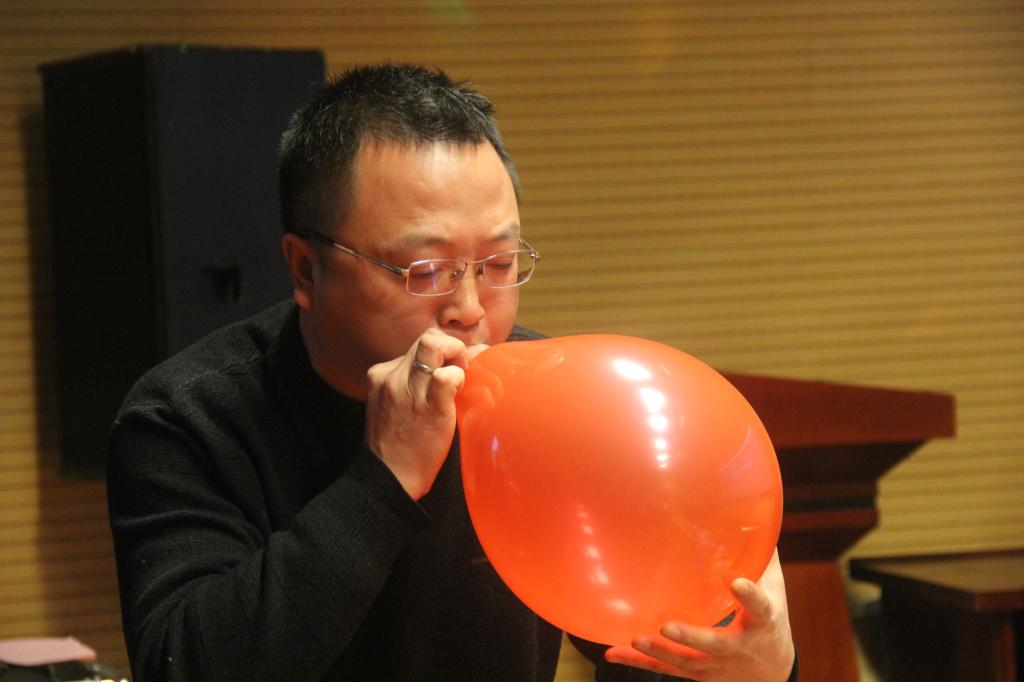 除了既定的表演节目外,现场还开展了临时互动的游戏环节。老师们通过手机软件,积极争抢游戏项目的机会。游戏项目“吹牛皮”让老师们在比拼吹气球的过程中一展教师的“肺活量”。
