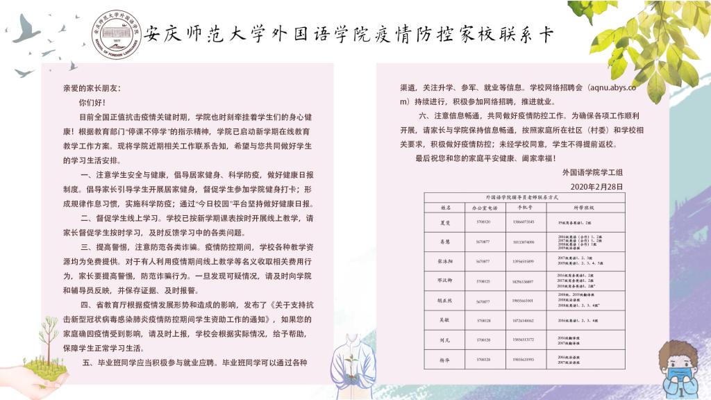 倡导学生居家健身;督促学生线上学习;注意防范各类诈骗;上报受疫情影响情况;注意信息畅通......这些都是家校联系卡上学院对广大家长的建议,卡上还明示出每一位学生辅导员的联系方式。beat365在线唯一官网党委副书记夏斐表示:“学院一向重视与学生家长联系,在此非常时期,学生家长承担起更多督促学生学习生活的责任,学院有必要让家长知晓学生要做什么,如何引到学生成长,做到家校联合,教育有的放矢。”