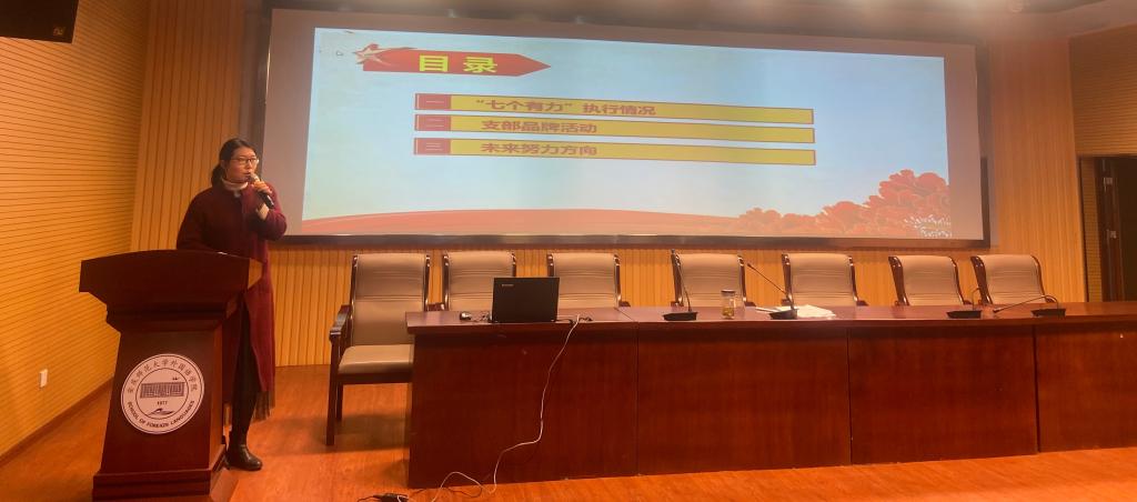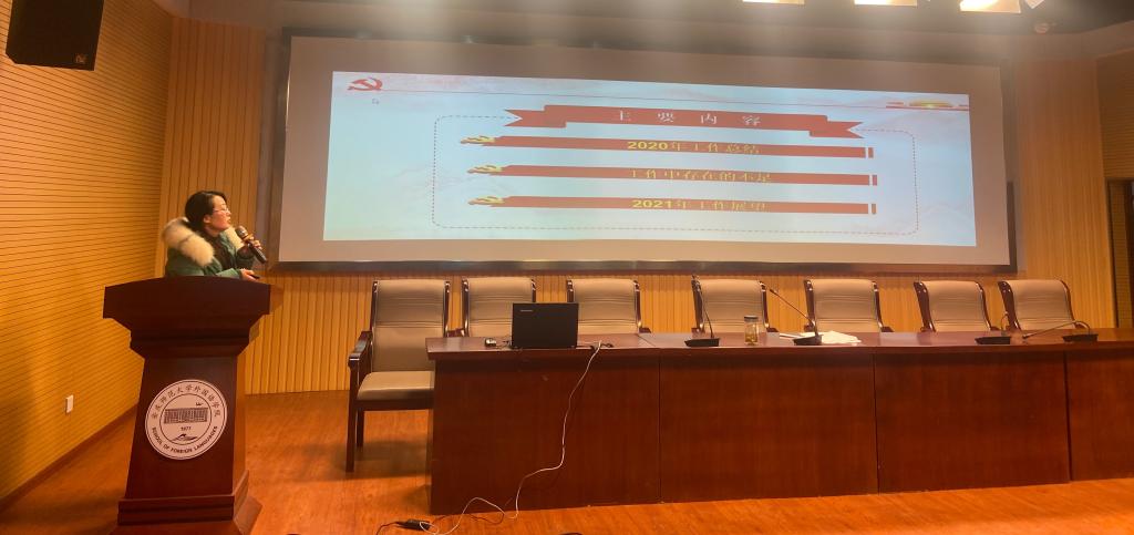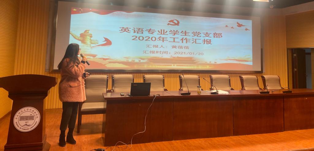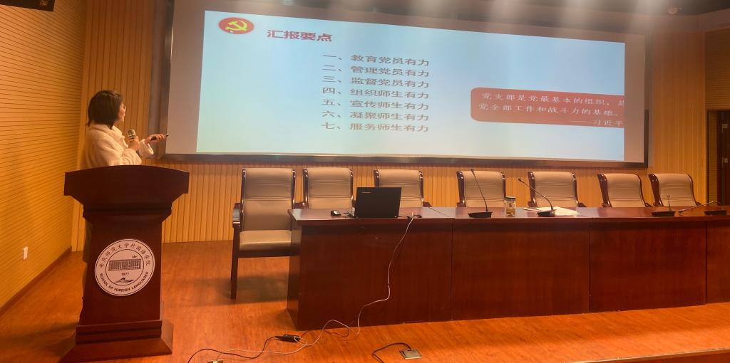 会上,10名党支部书记围绕一年工作、党支部七个有力标准建设以及特色品牌活动开展等情况逐一上台汇报展示,详细总结了各党支部一年以来以省级高校新时代党建设“双创”标杆院系党委建设为契机,充分发挥党员先锋作用,围绕学院中心工作推进事业发展所取得的各项成果。 2020年,各党支部攻艰克难,共同完成师范专业认证工作;翻译写作教研室党支部书记和商务英语学生党支部书记积极参与社区疫情防控服务,先进事迹被学习强国等媒体报道;学院五名学生党员获评校级疫情防控优秀志愿者;法语师生党支部学生刘童童获评安徽省“向上向善好青年”;学院“党建+创新创业”特色活动取得丰硕成果,学生项目在A类赛事中获得全国铜奖2项,安徽金奖3项。