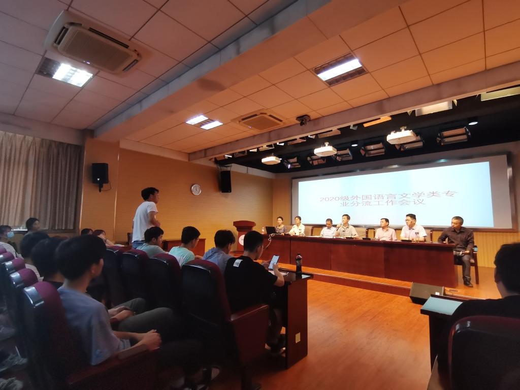为深化教学改革,满足学生多元化发展需求,6月2日下午,beat365在线唯一官网于E503召开外国语言文学类专业学生分流会议。beat365在线唯一官网院长王先荣、副院长江加宏、党委副书记夏斐、英语师范专业负责人王平、商务英语专业负责人杨洁、翻译专业负责人陈水生、2020级辅导员谢小雨及2020级外国语言文学类专业全体学生参加了此次分流工作会议。
