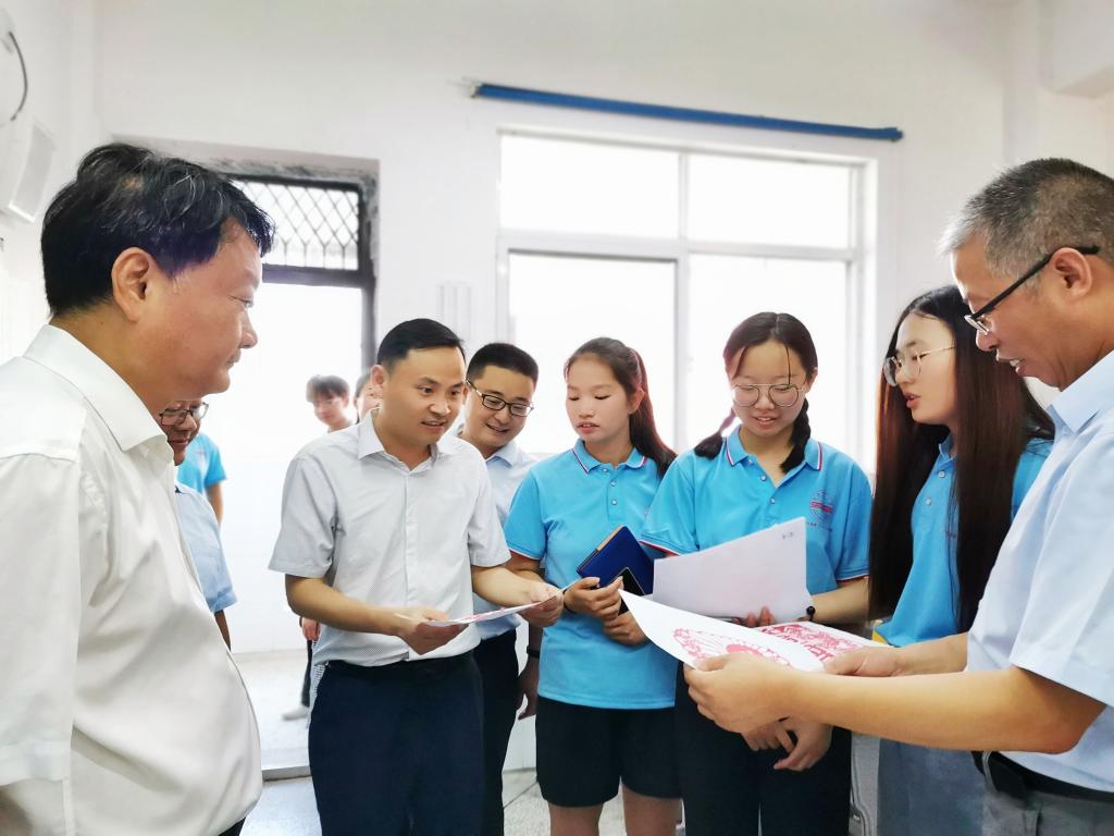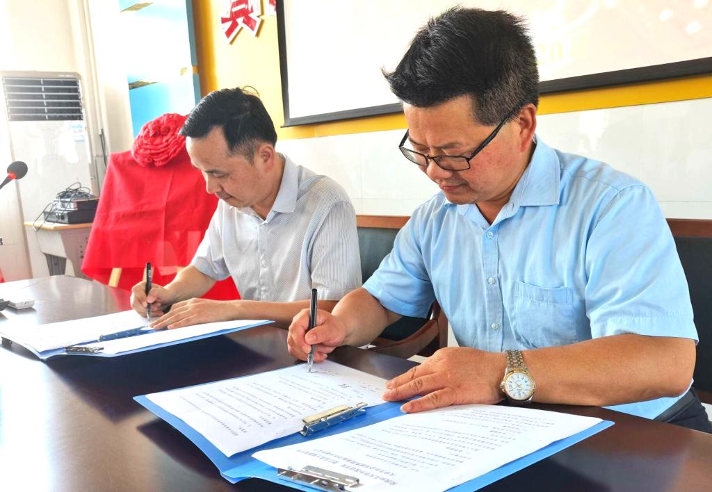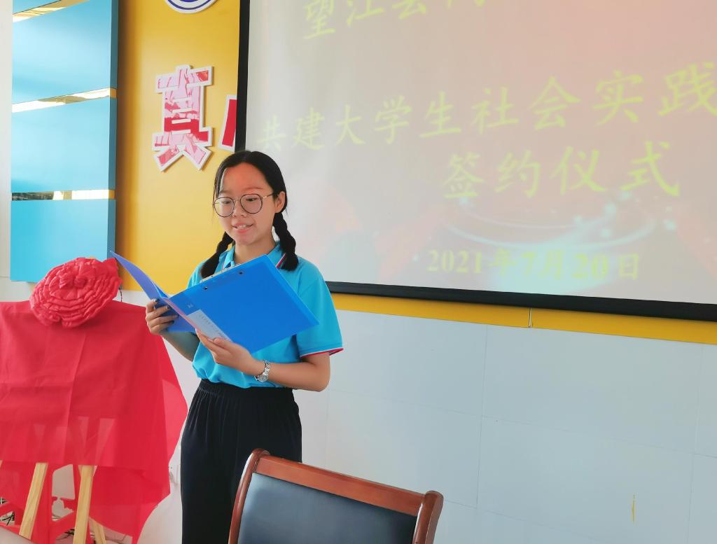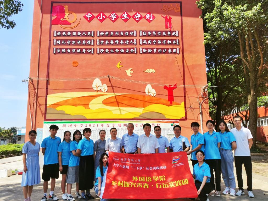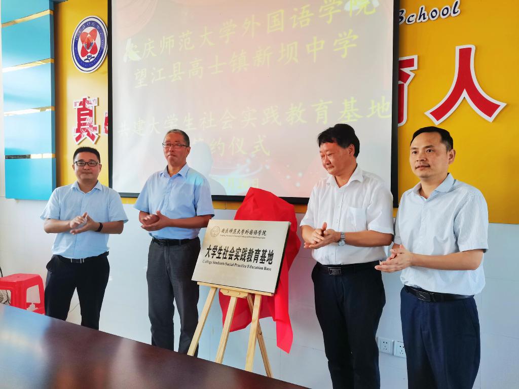 7月20日上午10时,beat365在线唯一官网与望江县高士镇新坝中学共建大学生社会实践基地揭牌仪式在望江县新坝中学举行。beat365在线唯一官网党委书记李亦亮、党委副书记夏斐、胡正然老师、谢小雨老师,高士镇党委书记王绍东、党委副书记郝加兵、副镇长曹嘉慧、团委书记章程,新坝中学校长、书记檀传奇,皖新传媒子公司皖新供应链经理杨雪以及三下乡实践团全体成员参加了本次揭牌仪式。