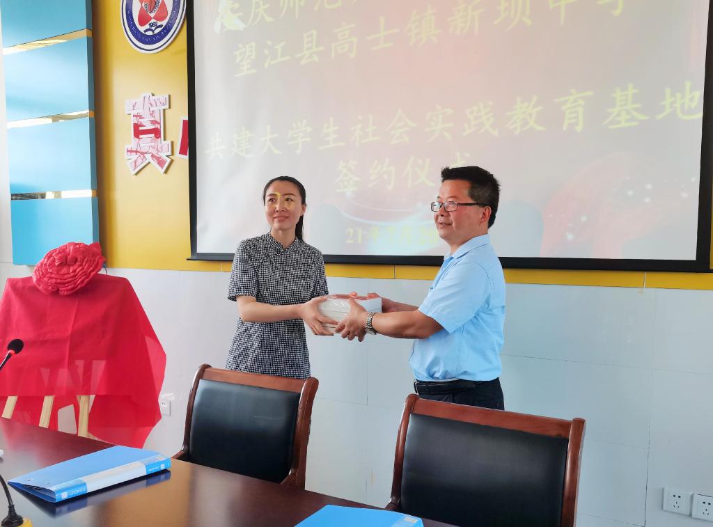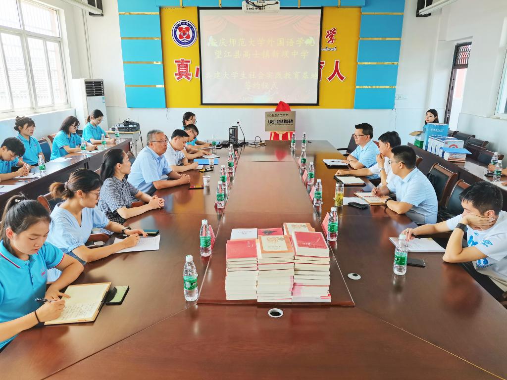 会上,beat365在线唯一官网外国学院与望江县新坝中学签署了共建大学生社会实践教育基地协议书并举行了揭牌仪式。皖新传媒子公司皖新供应链杨雪经理代表单位向新坝中学捐赠了图书。