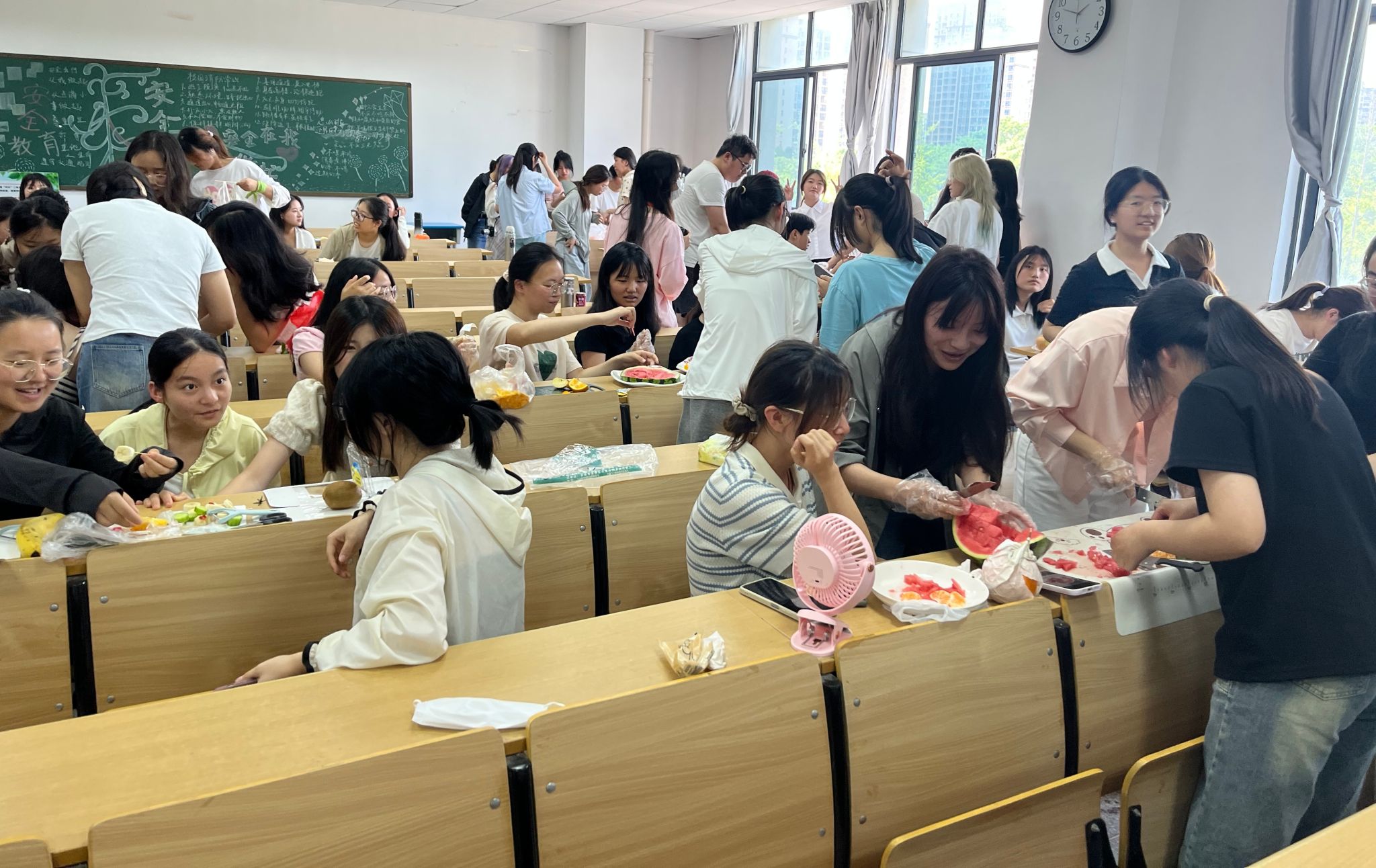 活动伊始,学生们将提前准备好的各类水果与工具摆放至特定位置,确认好画面的大致形状与拼盘的基本色调后,经过切割雕琢、摆盘等步骤,“财神爷”“海岛风光”“黄梅戏角色”“跳跳虎”……由不同的水果组合成的各类作品便呈现在学子面前。