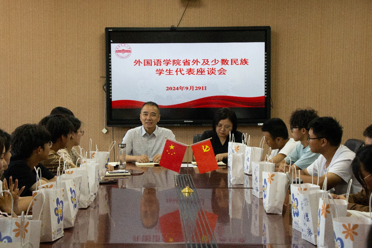 来自云南、甘肃、山东、湖北4个省份,回族、彝族、土家族等多个少数民族共计39名学生分别从学习、生活、未来规划等多方面进行了交流。 “刚进入大学时,担心作为一个外地人会感到孤独,却惊喜地碰到了许多志同道合的朋友们,感受到了很大的温暖。”来自山东2024级外国语言文学类4班的华帅表示,对于大学的学习生活更多靠自觉,要多参加活动,变得更加独立,积极地改变与融入大学生活。座谈会上,学院领导和老师表达了对同学们的关心并为同学们送上了慰问品。