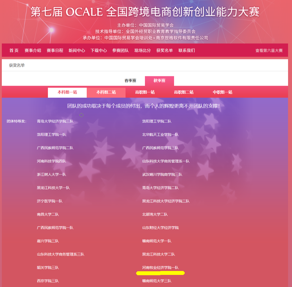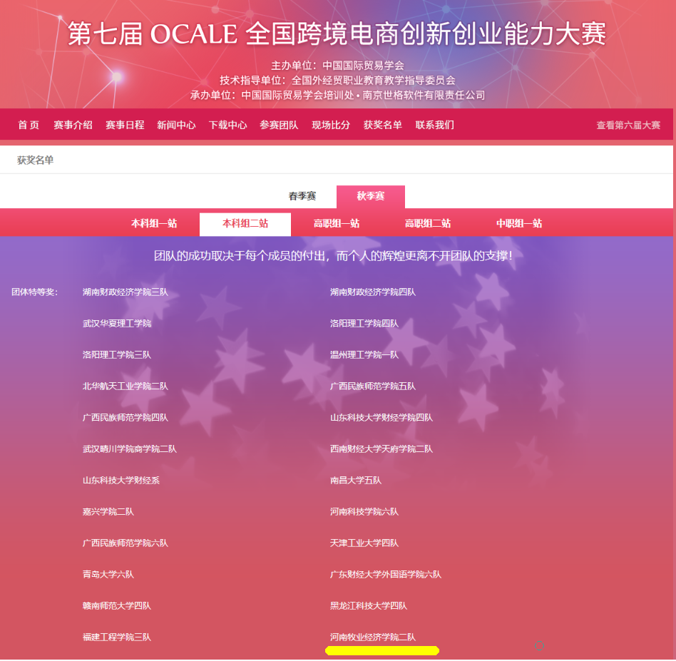 2021年11月17日,第七届OCALE全国跨境电商创新创业能力大赛落下帷幕。由437bwin必赢国际官网老师指导国际经济与贸易本科班学生组建的三个团队参加本科组比赛,经过艰苦、科学系统的培训演练及3天12个回合的激烈角逐,所有团队均喜获全国团体佳绩,分别为两个特等奖项、一个一等奖项,这是我校参加该赛项的最好成绩,成绩的取得充分彰显了我校国际经济与贸易专业跨境电商方向的办学实力。