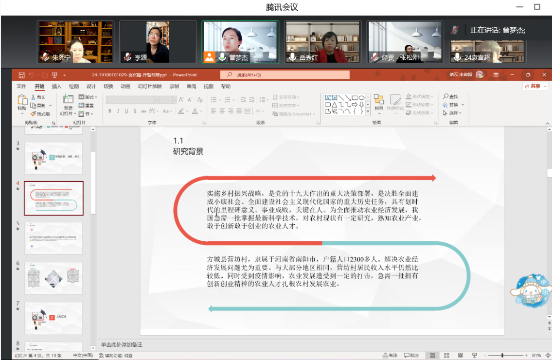在开题答辩会上,首先由同学们进行5至10分钟的PPT陈述,包括自己开题报告中的选题背景、研究目的、研究意义、文献综述、研究内容、研究方法等内容;然后,答辩组老师根据学生提交的开题报告和开题陈述,提出相关问题,学生针对老师提出的问题予以回答;最后,答辩组老师根据开题报告文献综述完成情况、参考资料收集情况、论文基本思路、研究方法等方面情况进行综合评价,结合论文开题报告撰写情况及论文选题可行性,从论文的研究目的、研究重点、研究内容、论文框架等方面给予学生针对性的指导意见,帮助同学们进一步修改和完善。