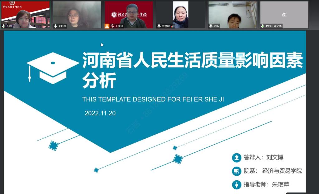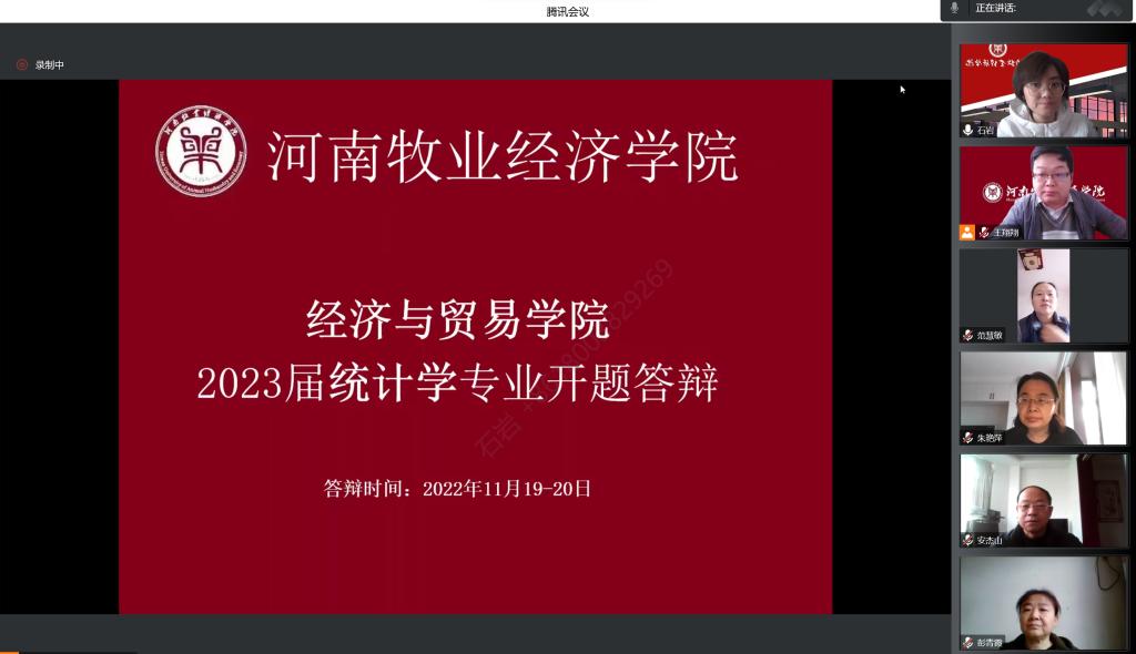 根据《河南牧业经济学院本科毕业论文(设计)工作条例》和《437bwin必赢国际官网统计学专业2023届本科毕业论文工作实施方案》的要求,必赢国际官网2023届统计学本科专业毕业论文开题答辩工作,于11月19日通过腾讯会议线上顺利进行,8位老师和57名同学参加了开题答辩。