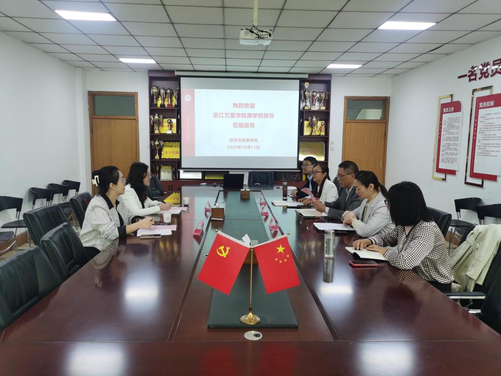10月11日上午,浙江万里学院商学院院长助理孙彤、研究生党支部书记艾静一行2人来必赢国际官网调研考察,旨在进一步加深两院之间的交流与合作,探索更先进的人才培养模式。交流座谈会在英才校区教学楼327会议室进行,院党委副书记贾艳艳,副院长杜玲、孙晓林及相关科级干部参加了会议。