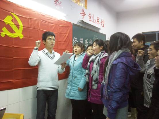 和25日下午2点30经济贸易系第二学生党支部在B211教室迎来了本支部接收预备党员及预备党员转正大会。对于参会的77位同学来说非常神圣时刻到来了! 恭听了振奋的国际歌后,大会首先由支部书记宣布大会流程,严格按照党章流程进行,先是由发展预备的学生依次进行个人的汇报,激情满怀地宣读了入党志愿书,表达了坚定的入党决心和对党的深刻认识,以及一年来自己各方面的进步。然后由组织委员和党小组组长分别介绍其一年来的考察情况供支部各成员参考,最后支部大会讨论并举手表决,结果一致通过48位学生成为党组织的新鲜血液。 接着,预备党员杨雪等29位同志依据转正申请书谈了预备期间的感想,并表达了转正决心,主要介绍自己在预备期一年里的思想转变的情况,然后由所有正式党员举手表决并顺利通过。 最后,被接受为预备党员的学生和转为正式党员的学生面对党旗进行宣誓。党组织对新成员的加入表示了热烈的祝贺,并对其提出了要求和希望。 此次会议有序计划,顺利进行,圆满成功!