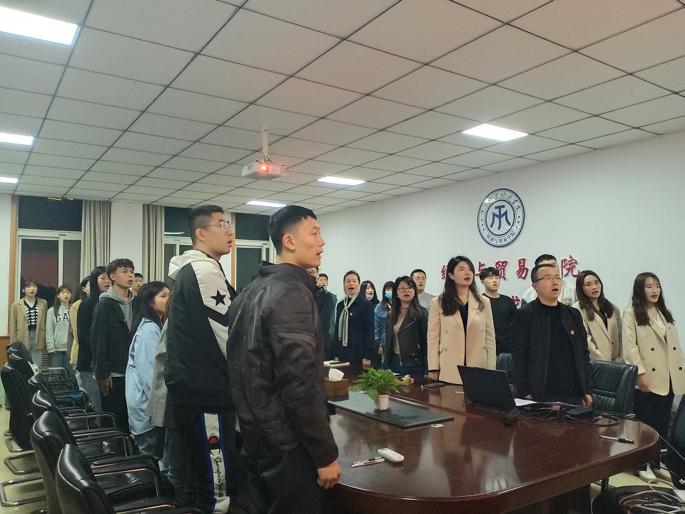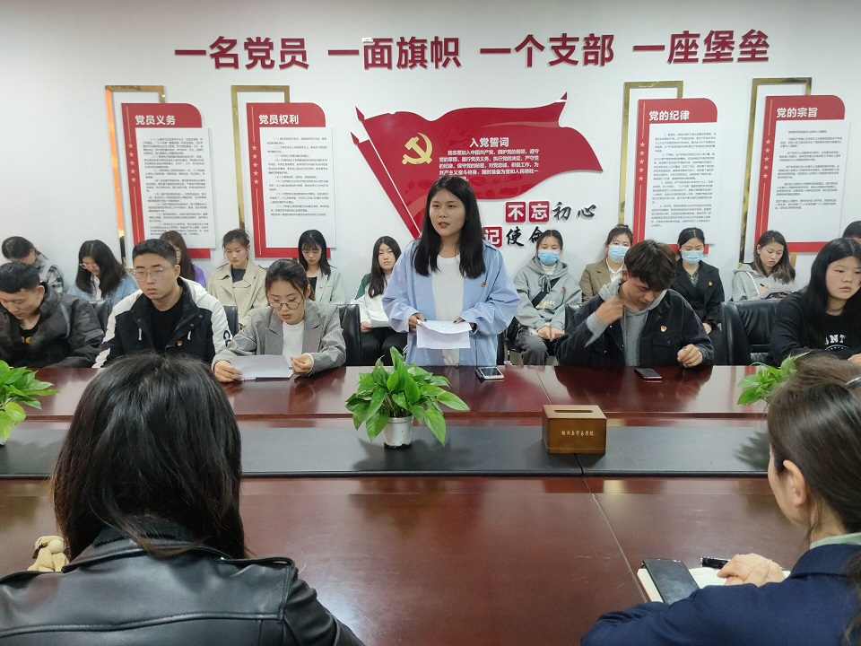在嘹亮的国歌声中,“我为评估做贡献,党员模范作先锋”主题党日活动开始。首先由学生党支部党员学习小组代表发言,孙梦雅、朱满菊、姬素雅等党员同志通过发言向大家表达了作为党员在评估期间,要在日常学习、学风建设、学生工作等方面切实发挥党员的先锋模范作用,突出表达了各党员同志争当党员模范先锋的决心。紧接着由教师党员代表董锦洋发言,他讲到学生党员的第一身份是党员,作为一名中国共产党党员要积极响应学院党委和学校党委的号召,牢记党员身份,发挥主观能动性,为我校顺利通过教学评估做出自己的贡献。之后,党委书记张松刚与党委副书记贾艳艳分别为各支部党日活动做总结讲话,张书记为即将到来的本科教学评估冲刺做动员,对广大党员群体前期工作做了充分的肯定,鼓励大家再接再厉,发挥党员先锋模范作用,为我校评估工作多做贡献。贾书记也鼓励各学生党员要身体力行,注重实践,不要空谈,积极参与党员活动,争当党员模范,为即将到来的迎评工作争光添彩。最后,由各支部学生党员代表带领大家重温入党誓词。在党员同志们洪亮的宣誓声中,本次党日活动顺利结束。