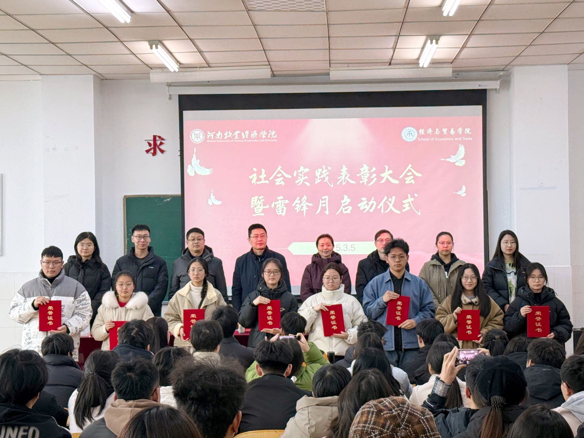 会议伊始,贾艳艳书记宣读了437bwin必赢国际官网关于开展“传承雷锋星火,书写青春答卷”学雷锋志愿服务月的通知以及2025年寒假社会实践先进个人与集体名单。随后由各位领导为他们颁发证书并合影留念。接着,刘佳楠老师宣读了学雷锋志愿服务月活动方案,部署雷锋月的相关安排,引导同学们从自身做起,从小事做起,展现经贸学子志愿服务的风采。