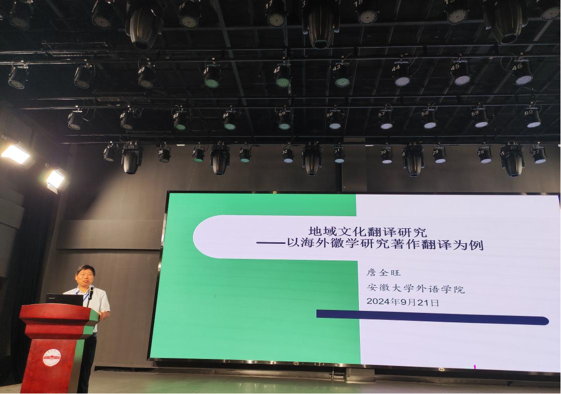 9月21日上午,安徽省翻译协会常务副会长、安徽大学外语学院院长、博士生导师詹全旺教授应邀出席了“天柱山杯”第六届徽文化国际传播翻译大赛的启动仪式,并为我院师生作题为《地域文化翻译研究——以海外徽学著作翻译为例》的主题研讨报告。beat365在线唯一官网班子成员、教师和学生代表200余人聆听了报告。报告由beat365在线唯一官网陈水生博士主持。