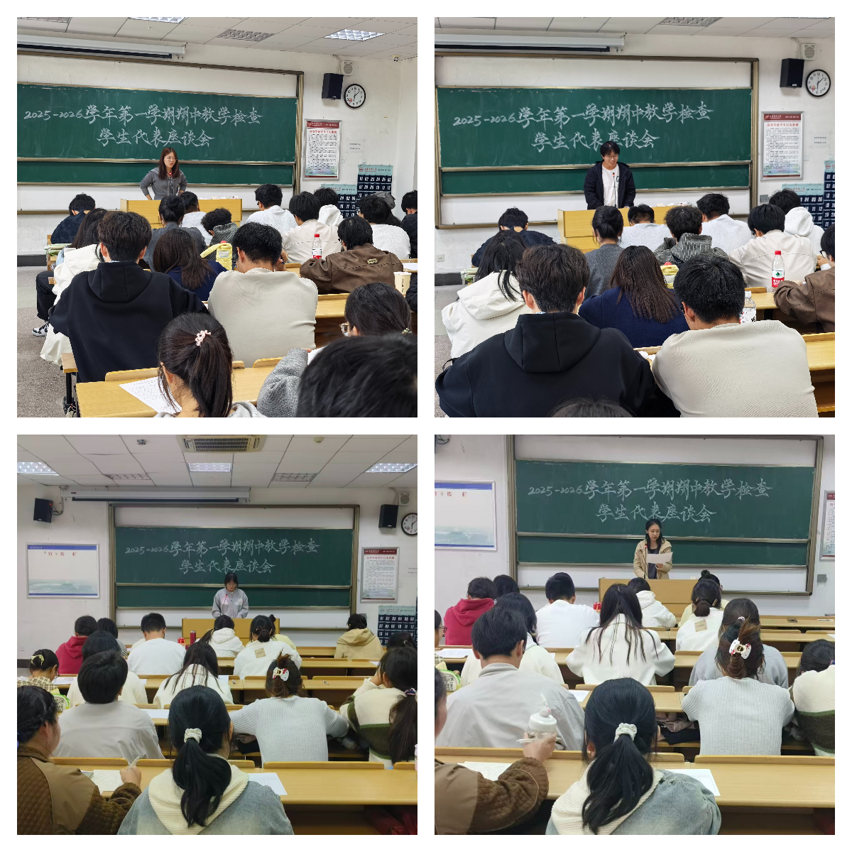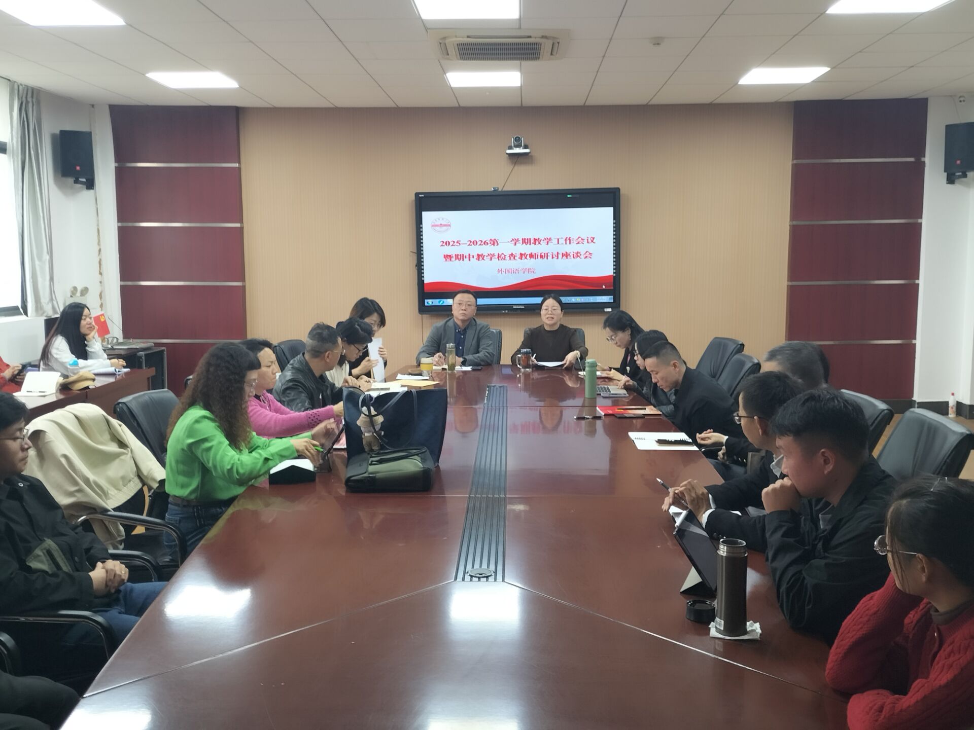 11月5日下午,beat365在线唯一官网在E304会议室和E314教室同步举行2025-2026学年第一学期期中教学检查教师研讨座谈会与学生评教座谈会。学院副院长黄全灿、瞿宁霞,各专业负责人、教研室主任、院级教学督导、AI课程负责人及骨干教师、新进教师代表参会;全校非外语类与外语类专业学生代表参加评教座谈。