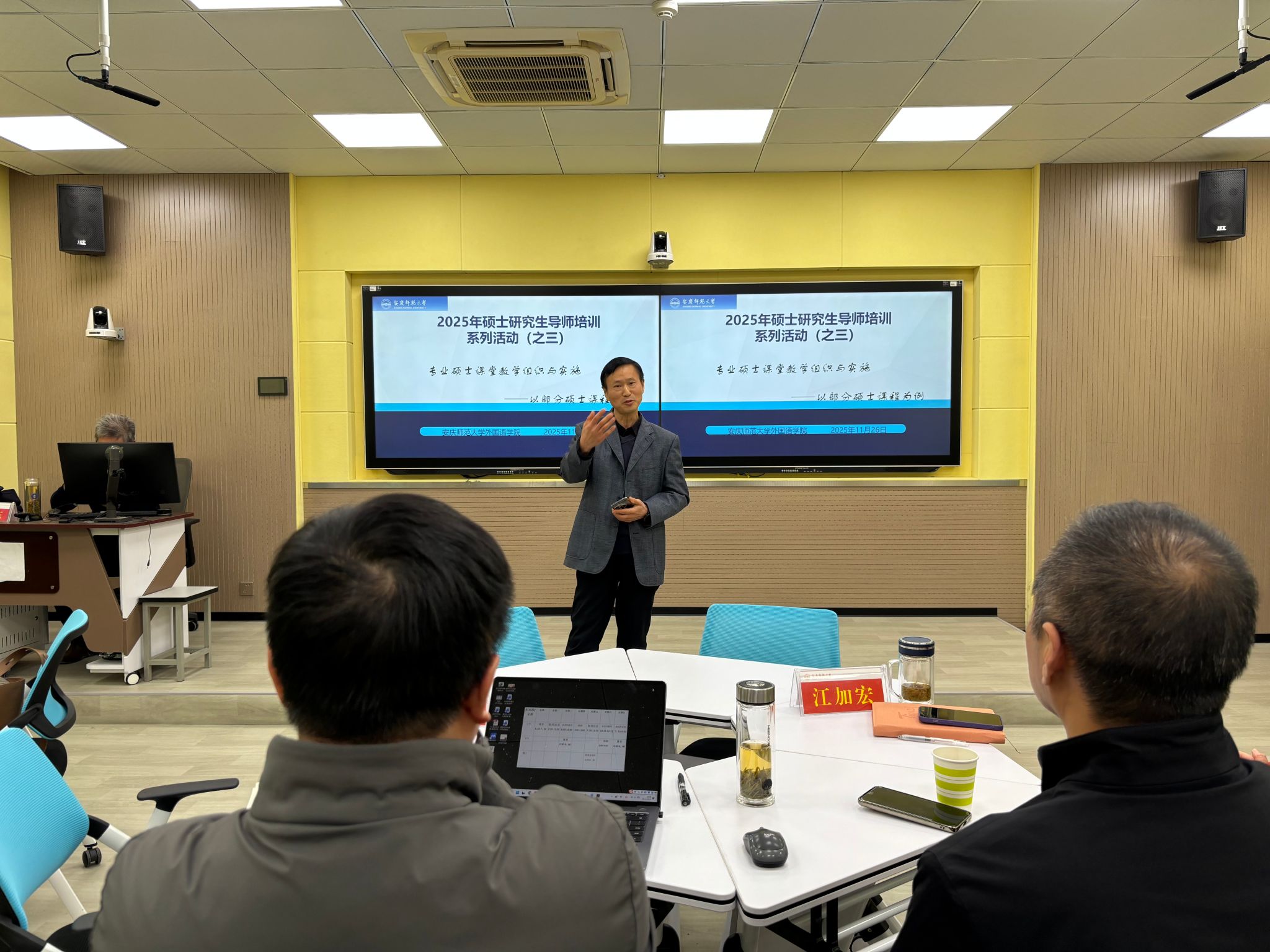 活动伊始,院长江加宏发表致辞。他指出,研究生教育是衡量高等教育办学水平的重要标志,是培养高层次创新人才的关键阵地,课堂教学则是保障人才培养质量的核心抓手。他强调教师应结合学院学科特色与专业硕士培养定位,将学科优势转换为教学优势;同时要坚守“立德树人”初心,以言传身教为学生树立学术典范与人生标杆,在潜移默化中培育学生的学术素养与职业操守。
