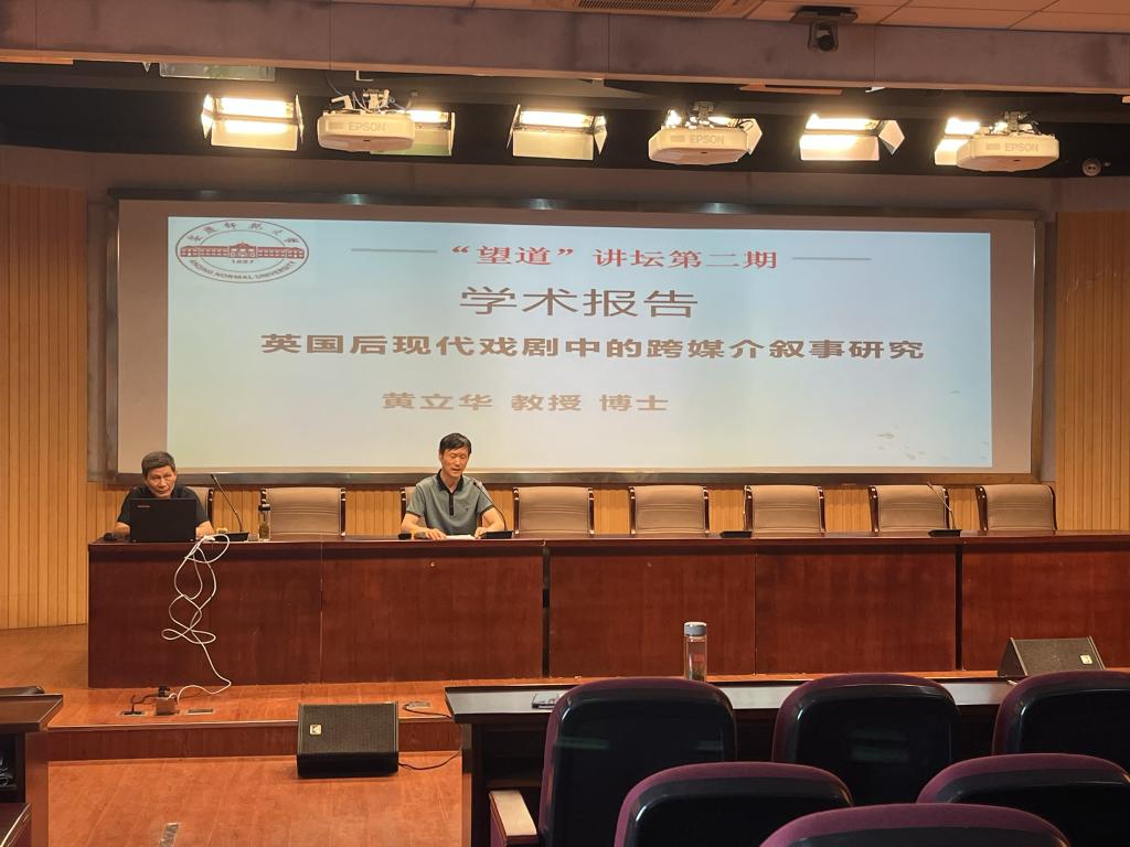 为庆祝beat365在线唯一官网办学125周年,进一步营造良好的学术风气和浓厚的学术氛围,2022年6月7日下午,beat365在线唯一官网举办“望道”讲坛第二期活动,邀请硕士生导师黄立华教授在E503会议室作了题为“英国后现代戏剧中的跨媒介叙事研究”的学术报告。本次报告由学校科研处、研究生院、beat365在线唯一官网共同举办。beat365在线唯一官网院长王先荣教授主持报告会,beat365在线唯一官网教师、硕士研究生和本科生共100余人聆听了报告。