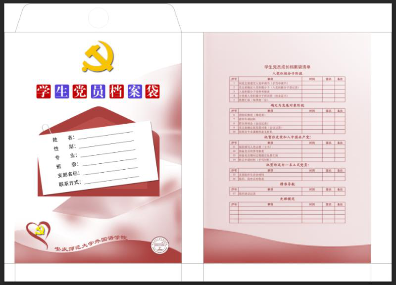 为落实全面从严治党,切实加强基层党组织标准化建设,严把党员发展质量、规范党员发展过程监督、强化党建档案制度管理,针对党建督查中暴露出的党员发展问题,beat365在线唯一官网党委近期设计印制了“学生党员成长档案袋”。