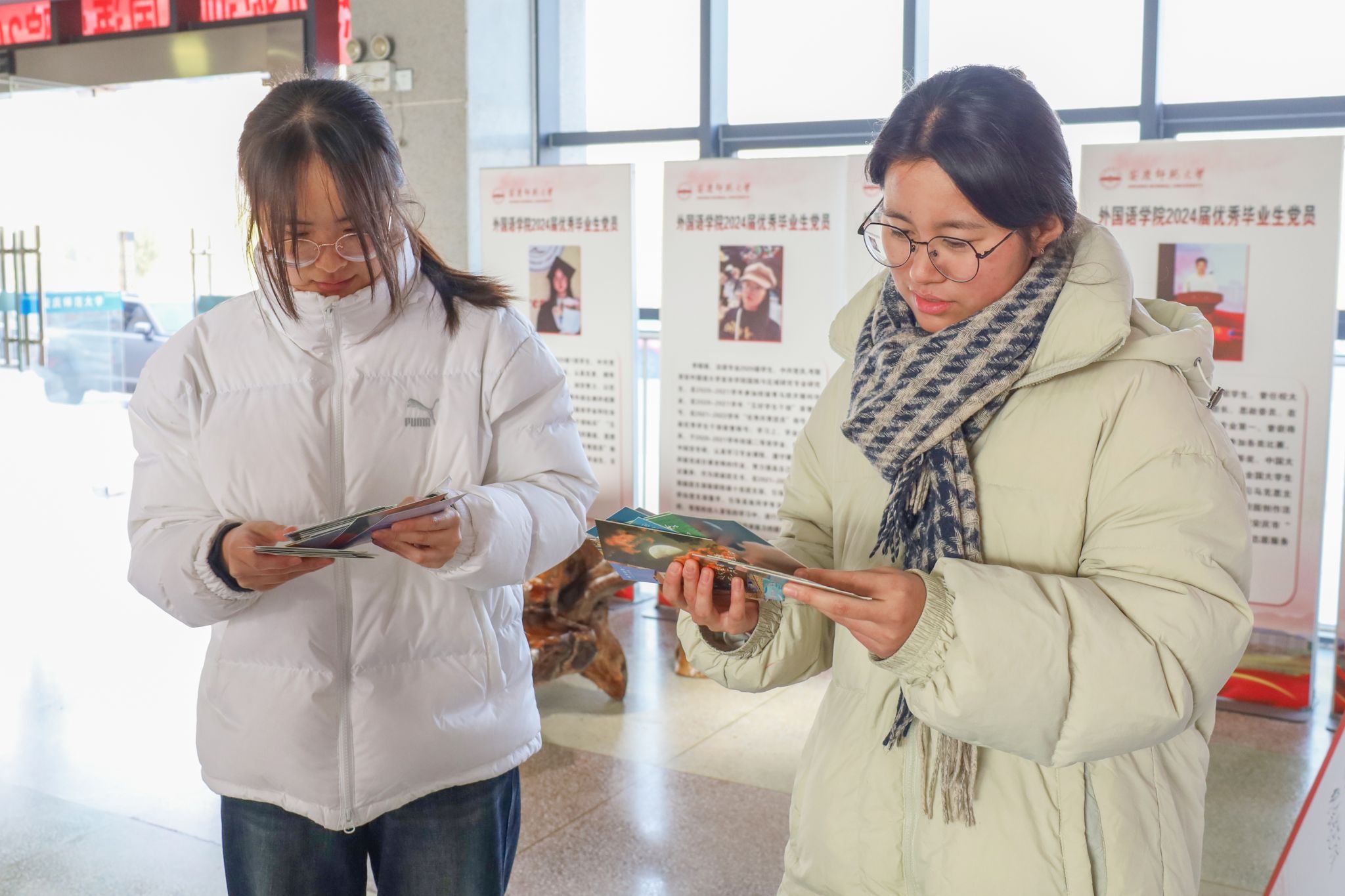“黎明已晓,旭日东升,拂晓之风带来胜利的曙光,愿你笔锋所至,皆为心之所向。”在此前举行的“研途与共,携手同行”明信片祝福活动中,外国语言文学类专业2024级新生们精心挑选出明信片,并一笔一画认真地写下自己对考研学子的最美好和最真挚的祝福。活动现场,近两百余张满载心意、“沉甸甸”的明信片被一一赠予考研学生。