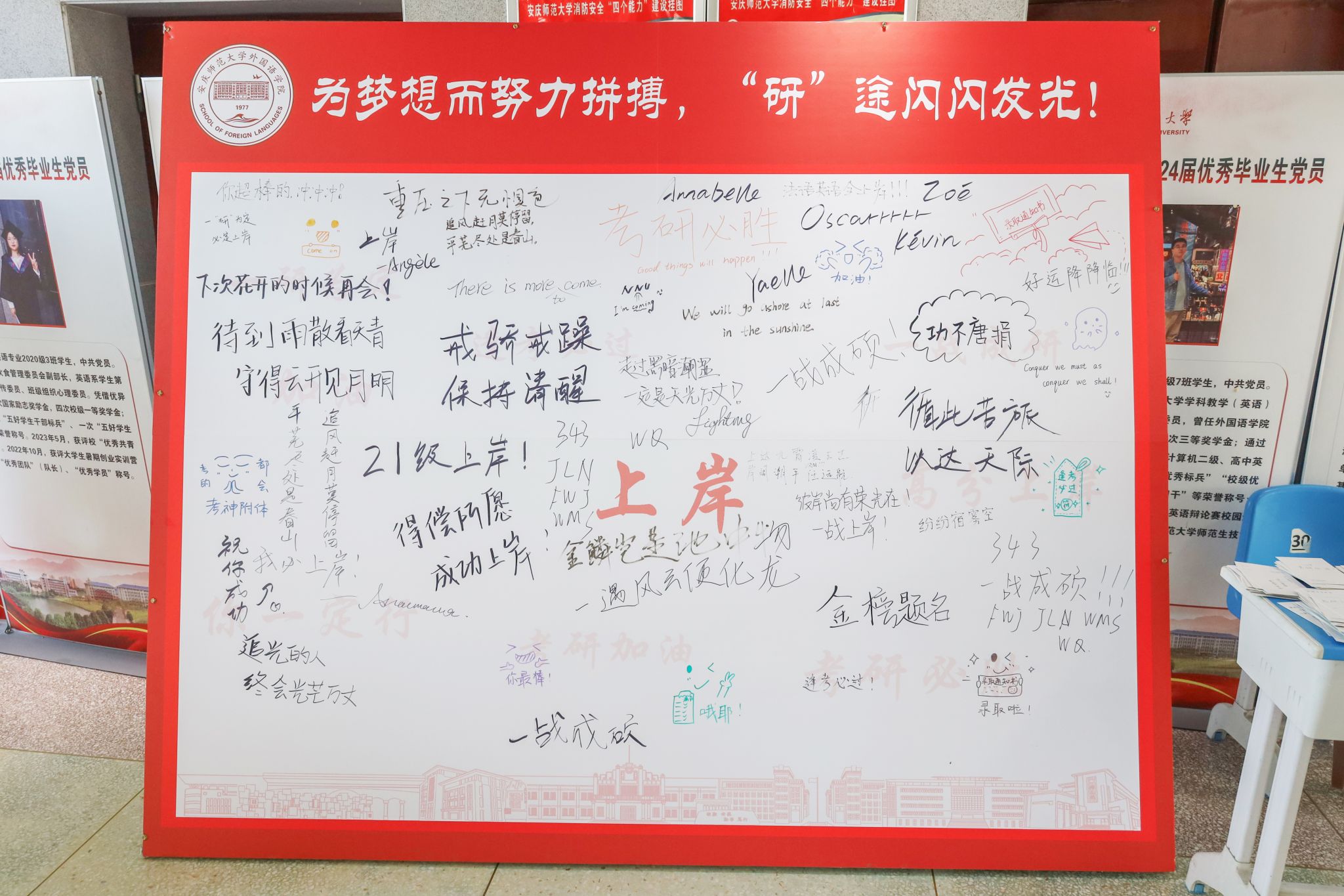 “重压之下无惧色”“追光的人,终会光芒万丈”“金鳞岂是池中物,一遇风云便化龙”……本周就将迎来2025年研究生招生考试,迎接胜利的钟声即将敲响,学生们纷纷在考研留言墙上写下“豪言壮志”,以激励自己坚持到最后一刻。