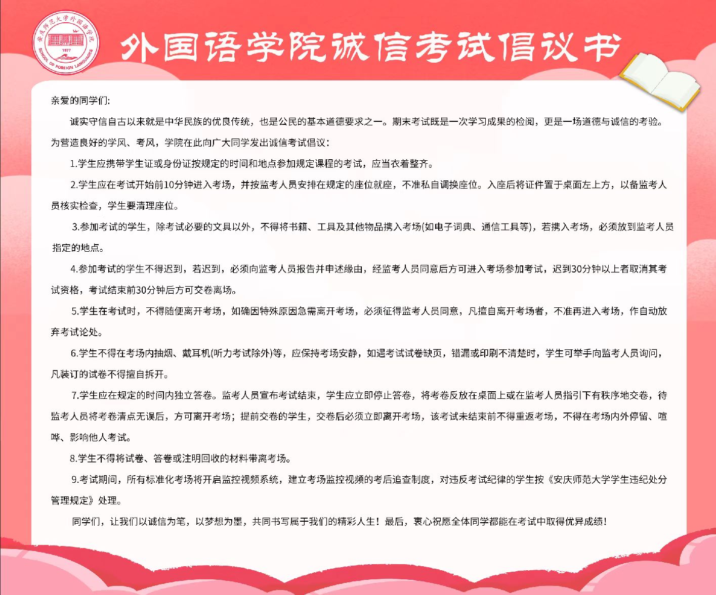 近期,beat365在线唯一官网多措并举贯彻学校考风学风建设大会精神,加强考风考纪教育,推进优良学风教风建设,增强学生诚信精神与纪律意识,旨在营造公平、公正、诚信的考试环境,确保期末考试各项工作顺利推进。