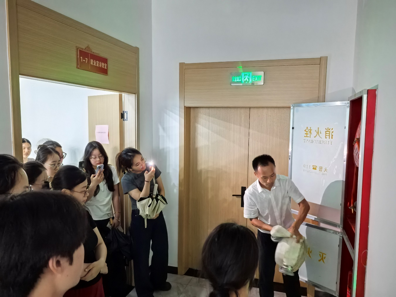 理论宣讲结束后,全体同学移步至室外演练场地,在张老师的指导下分组进行消防器材实操训练。张老师现场演示了干粉灭火器“提、拔、握、压”四步操作法,并指导同学们轮流进行灭火模拟演练。针对消火栓、水带连接等设施,学生们两人一组完成快速组装、喷射等实战操作。
