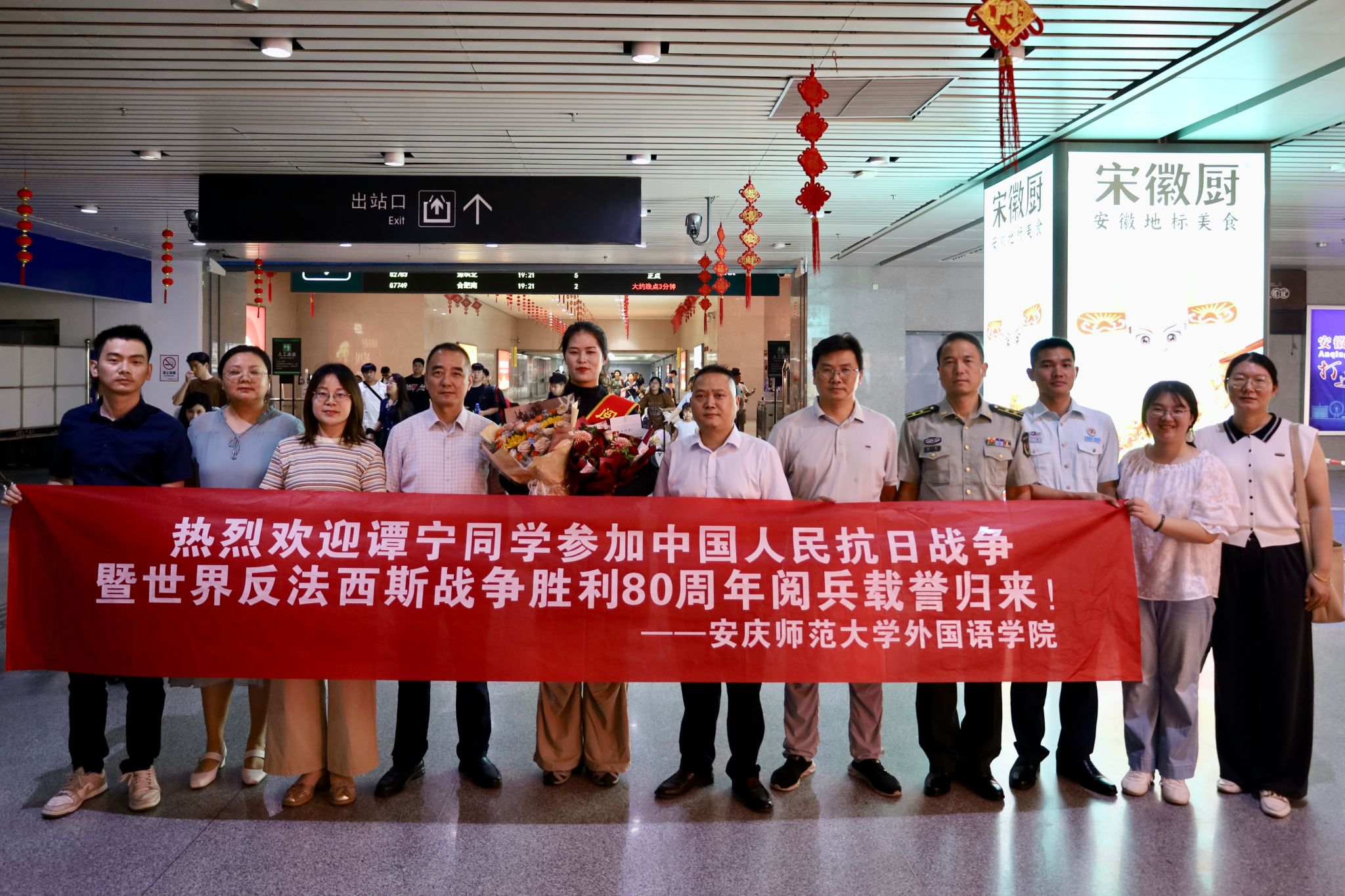 2025年9月3日,纪念中国人民抗日战争暨世界反法西斯战争胜利80周年大会圆满落幕。参与此次阅兵任务的原中国人民解放军仪仗司礼大队退役士兵,我院商务英语2023级专业1班谭宁同学载誉归来。学院对此高度重视,特地组织师生代表前往火车站迎接,现场气氛温馨而热烈。