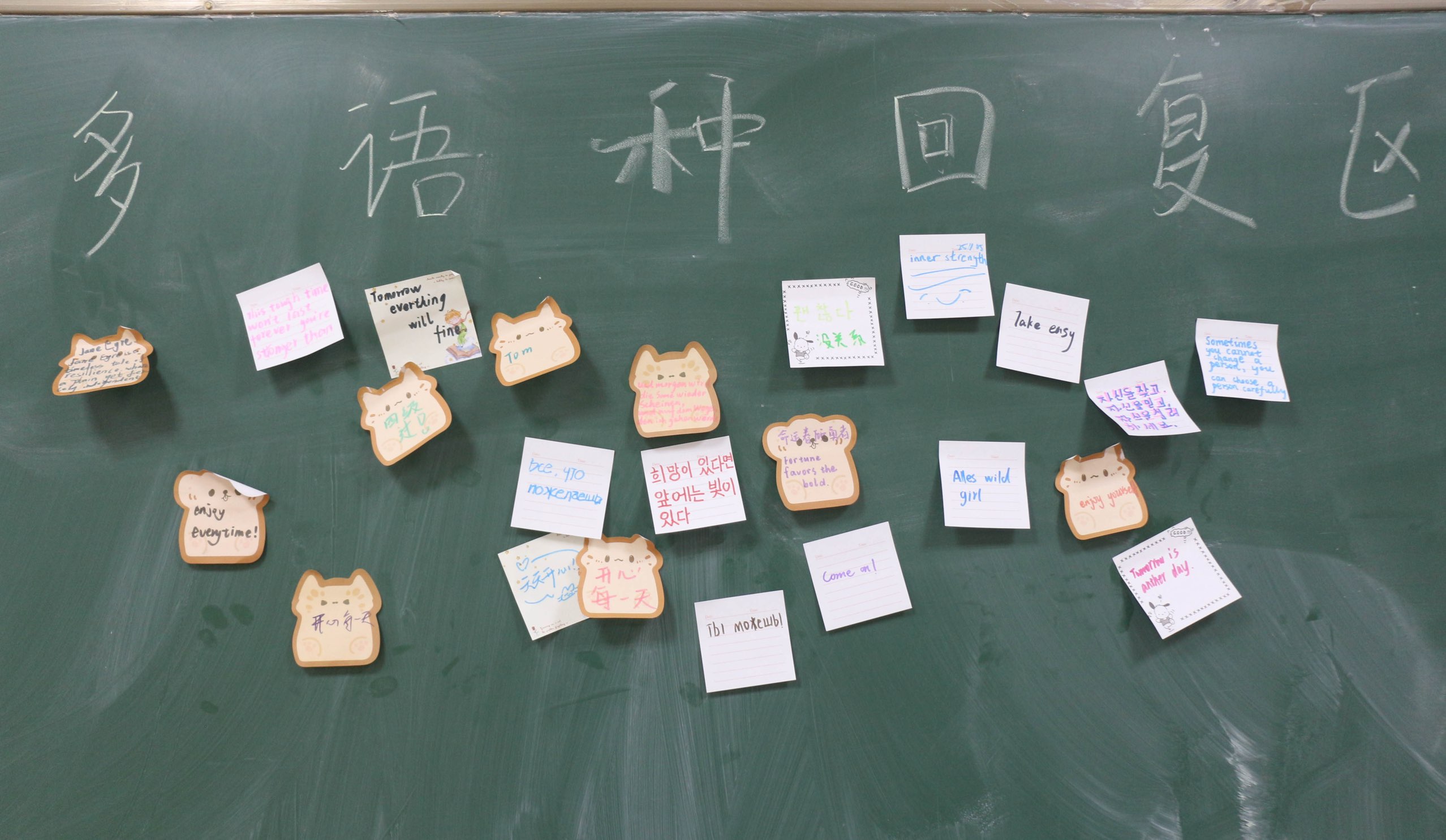 活动中,黑板左侧设置“烦恼便签区”,学生用不同语种倾诉近期学业、生活中的困惑与压力;黑板右侧设置“多语种回复区”,提供各国语言贴纸,鼓励同学们积极分享励志感悟与暖心祝福,主动记录校园趣事与成长收获。普通的黑板因一张张承载真挚情感的便利贴,成为连接心灵、传递善意的重要载体。同学们在书写中释放情绪、梳理思绪,在阅读他人留言时汲取温暖与力量,切实感受到关怀与集体温暖。此外,活动现场还设置了互动交流区,鼓励同学们围绕留言内容开展面对面沟通,将文字间的温情转化为真实的情感联结与人际互动。