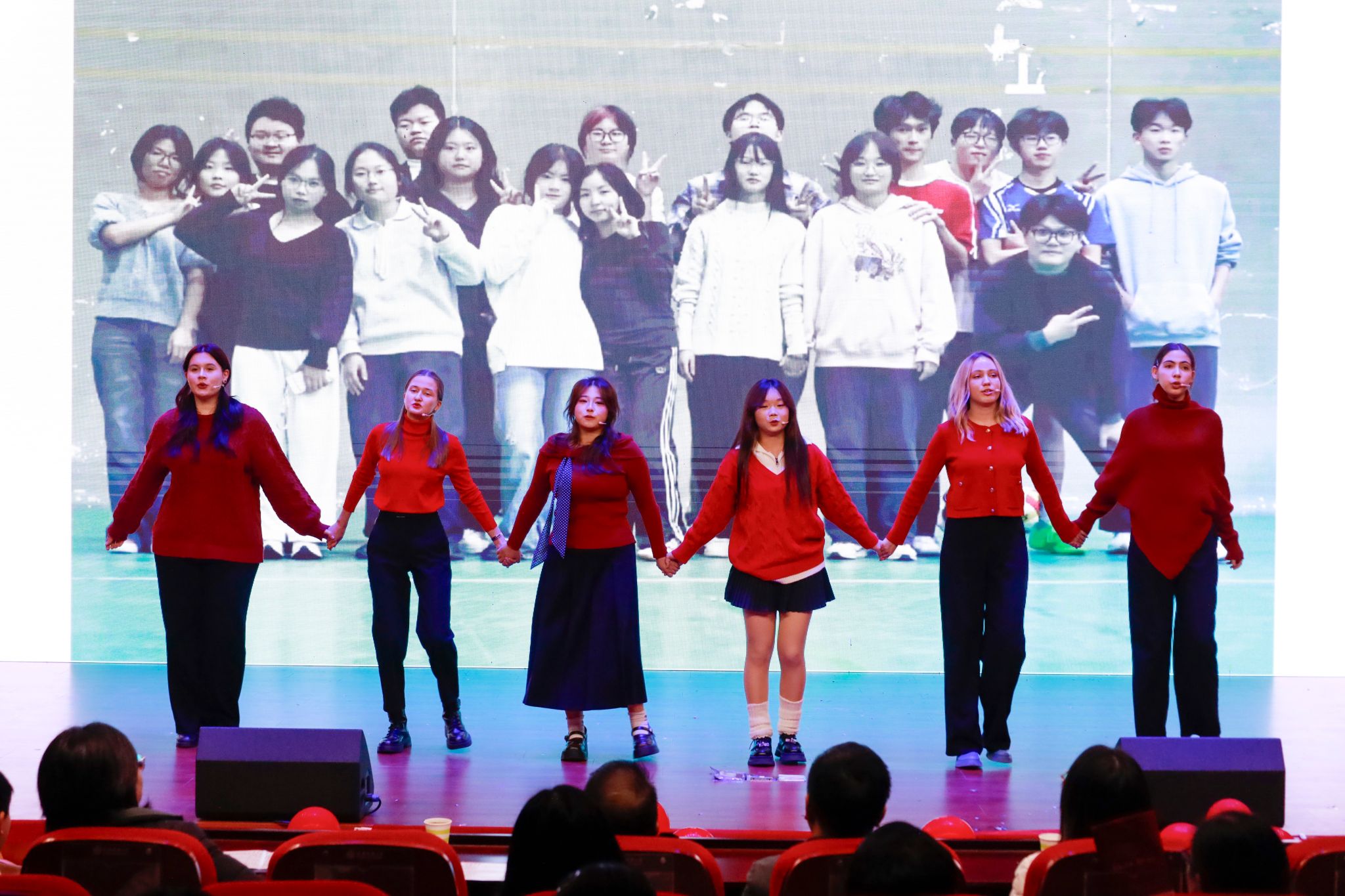 “除了快乐,禁止入内!”——轻快而坚定的歌声瞬间点燃全场热情。随后,小品《宿舍反诈启示录》以“当诈骗套路撞上机灵室友”的诙谐桥段,在笑声中筑牢安全防线;舞台中央,乐器合奏《小美满》流淌出温暖恬静的生活诗意;少数民族学子深沉吟唱“大山啊大山”,辽阔的乡土情怀萦绕心间;多语种《友谊地久天长》歌声交融,不同语言的真挚情谊在空气中流淌,余韵悠长;朗诵《青春护山河》以磅礴的气势、炽热的情感,展现了新时代青年与祖国山河血脉相连的深厚情谊……