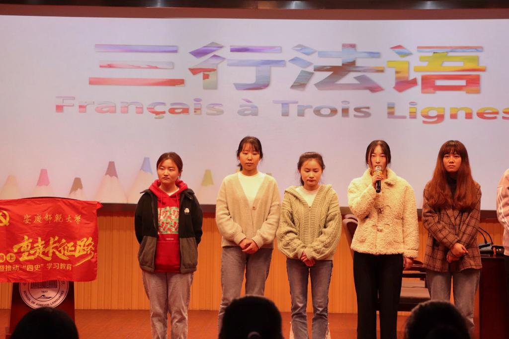 随后进行的“四史”知识竞答环节中,同学们争先抢答,展示了丰厚的知识储备,进一步巩固了大家对相关知识的掌握程度。在“三行法语”互动环节中,同学们再次用法语表达了自己的学习体会,2017级法语专业的余苗苗说:“改革开放以来,我国教育、科技、文化等社会事业蓬勃发展,人们思想极大解放,中国在世界的地位不断提升。我们作为新时代的大学生,应该更加努力,提升自己的综合素质,夯实自己的科学文化知识,为国家深化改革贡献自己的一份力量。”