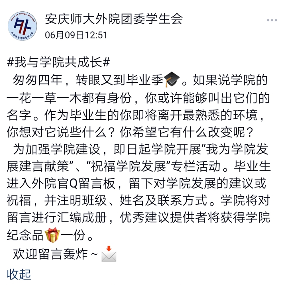 6月,学院在官Q开设“我为学院发展建言献策”“祝福学院发展”等专栏,毕业生们积极进入专栏留言,留言注明班级、姓名及联系方式,学院将对留言进行整理汇编成册,好的建议将获学院纪念品一份。同时,学院开展“我与学院共成长”——毕业生代表与学院领导进行茶话活动,回顾过去,抒发感想,情系母校,建言献策。