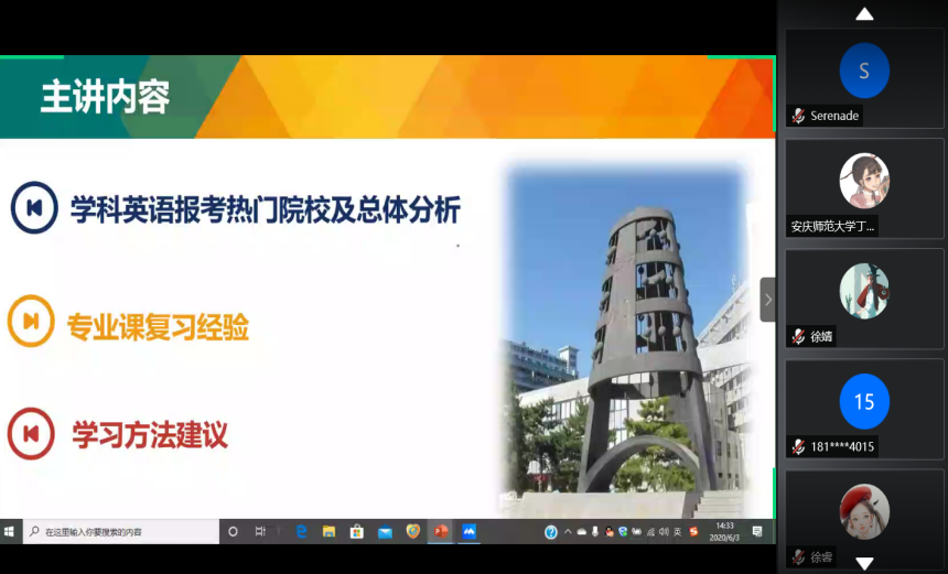 为帮助学生更好地了解考研形式,明确考研规划,掌握备考技巧,6月3日下午,beat365在线唯一官网依托线上平台成功召开了考研经验交流会,11位2016级学生代表及300余名学生参加了此次会议。