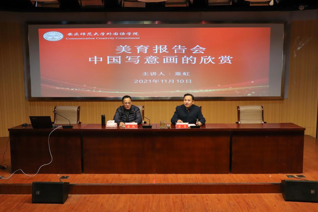 11月10日,beat365在线唯一官网在E503教室举行以“中国写意画的欣赏”为主题的美育报告会,安徽省美术家协会会员、安庆市美术家协会副主席、安庆市政协书画院画家童虹应邀作报告,报告会由学院党委副书记夏斐主持,学院入党积极分子、青马班学员与艺术俱乐部成员共130余名学生参加了报告会。