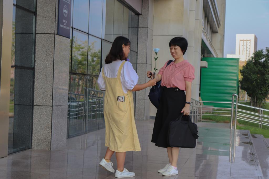 英语专业2020(8)班的王碧莲一直站在学院门口准备明信片和花束,为来往的老师送去节日祝福。她说:“很开心能够参加这次活动,为我们学院奉献出了一份力量。这次参与的人数比较少,但是我们每个人都在尽自己的努力,把事情做到最好。”她表示,自己以后也想当一名人民教师,去培育更多的人才,为祖国的教育事业贡献出一份力量。
