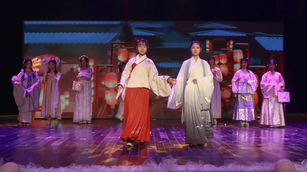 在学院礼仪队的节目《华夏衣冠》中,妆容精致的表演者身穿各种风格的传统汉服,伴随着优美的古典音乐舞动身姿,向观众展示了汉服的唯美和典雅。“希望能为观众们展现传统文化的魅力和风采。”礼仪队的演员表示。