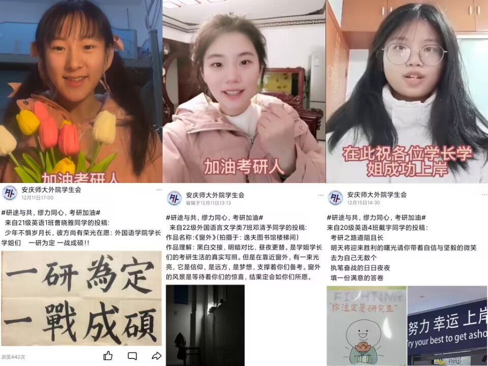 “君不见长松卧壑困风霜,时来屹立扶明堂。”“山水总相逢,来日皆可期。”“关关难过关关过,前路漫漫亦灿灿。”……从12月初起,通过beat365在线唯一官网的新媒体平台,100余位教师和学生向考研学子表达祝福。或是以原创语段,或是以摄影图片,或是以经典文段,更有老师请来家中“萌宝”拍摄视频一同为学生“摇旗呐喊”、“加油鼓劲”!