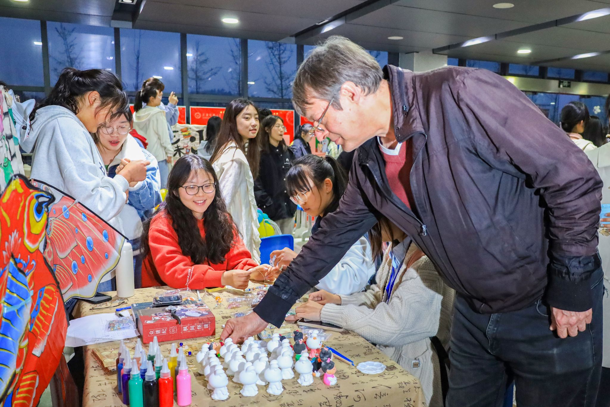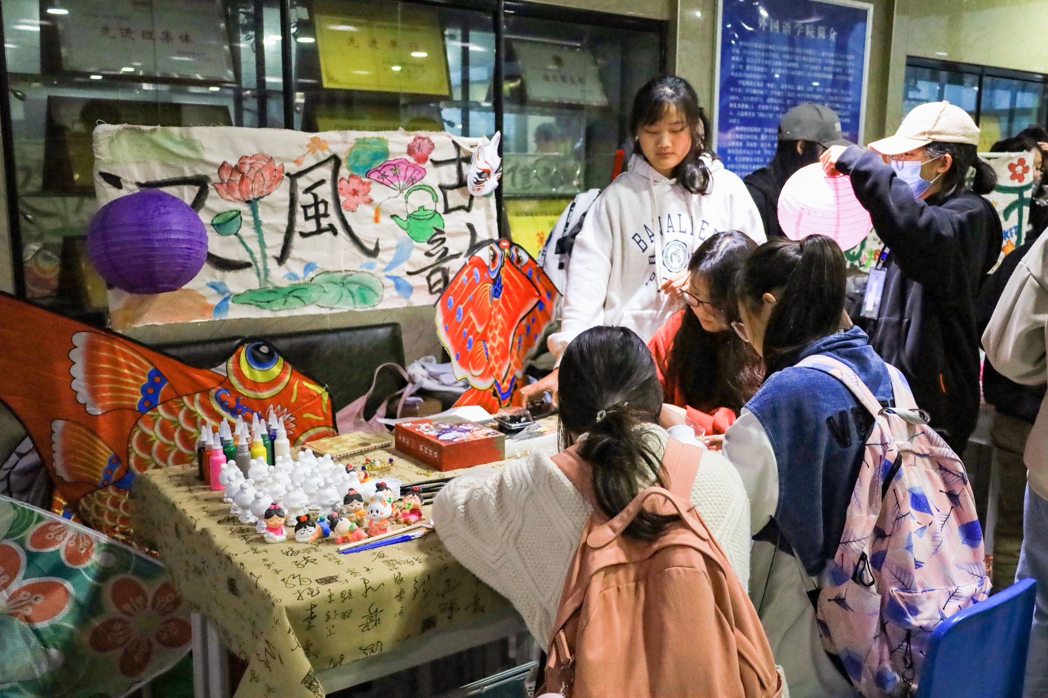 古典含蓄的书法扇面、形态可爱的石膏娃娃、精致美观的纸鸢……beat365在线唯一官网的汉风古韵铺和美术学院的艺见倾心展合力打造“艺术天堂”,引得不少学生停足驻留。外国语言文学类专业2022(3)班的丁明雅现场制作古风手链,直言“过了把古风瘾”。