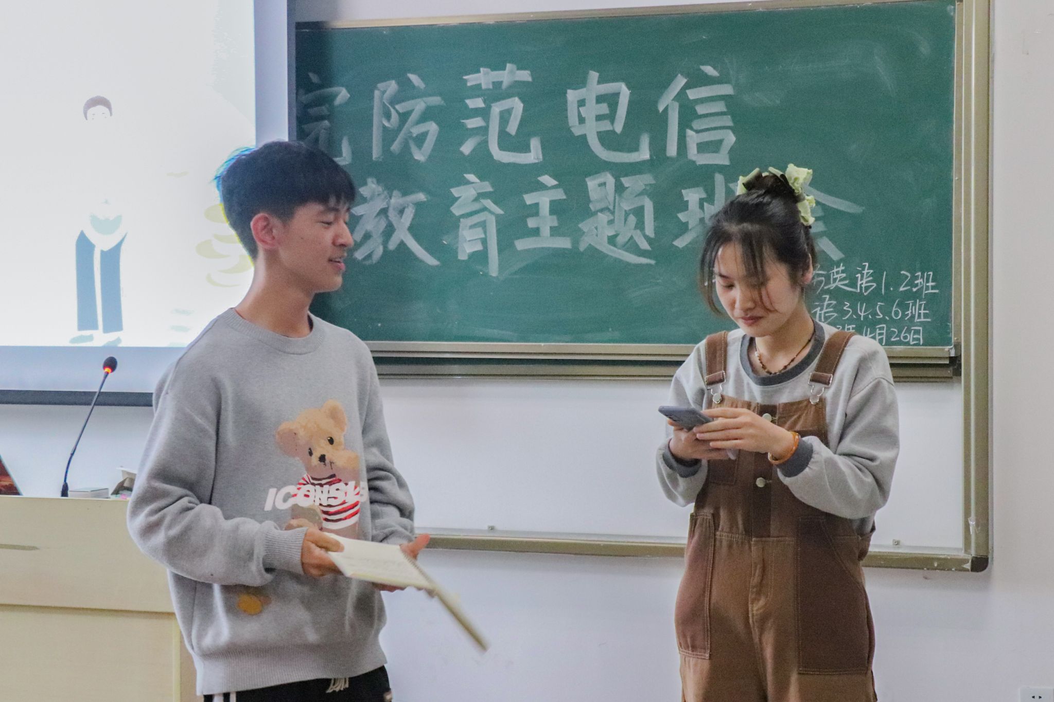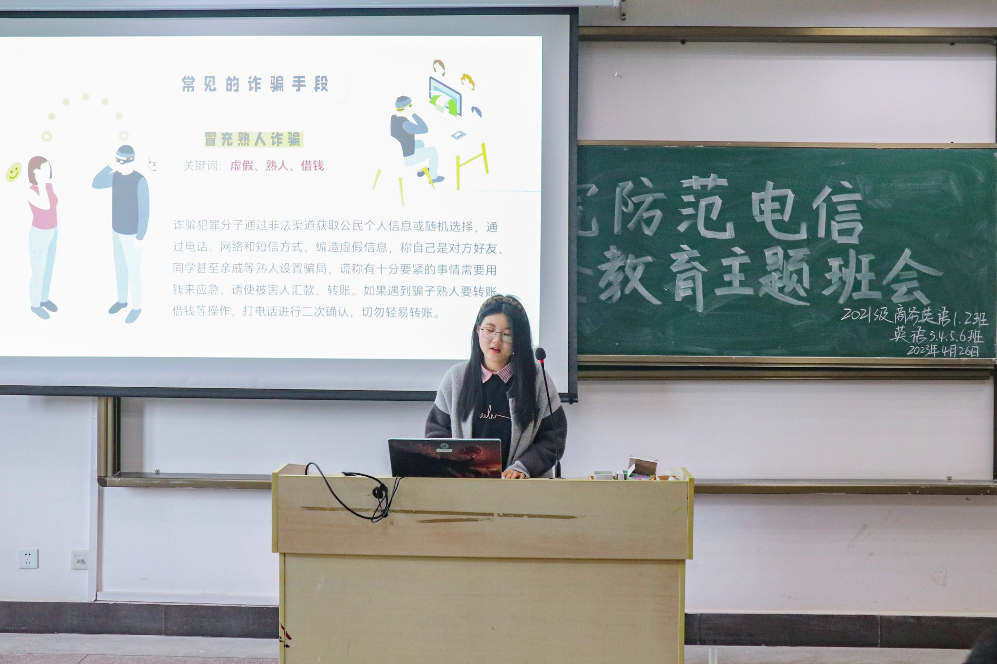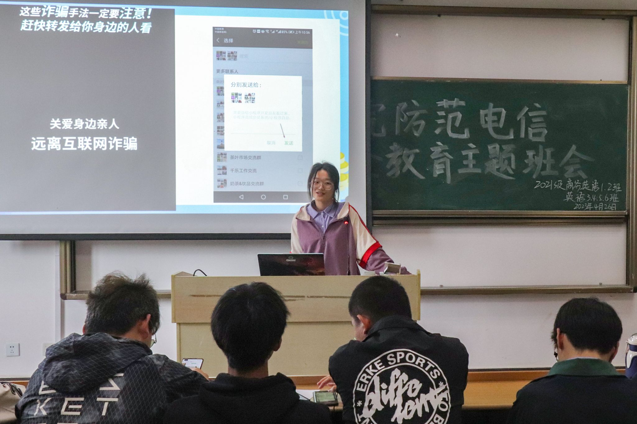 4月26日,beat365在线唯一官网商务英语专业2021(1)班、商务英语专业2021(2)班以及英语专业2021(3)至(6)班在206教室开展联合班会。近200名学生成为班会“主讲人”,用多样化方式宣讲防范电信网络诈骗知识。