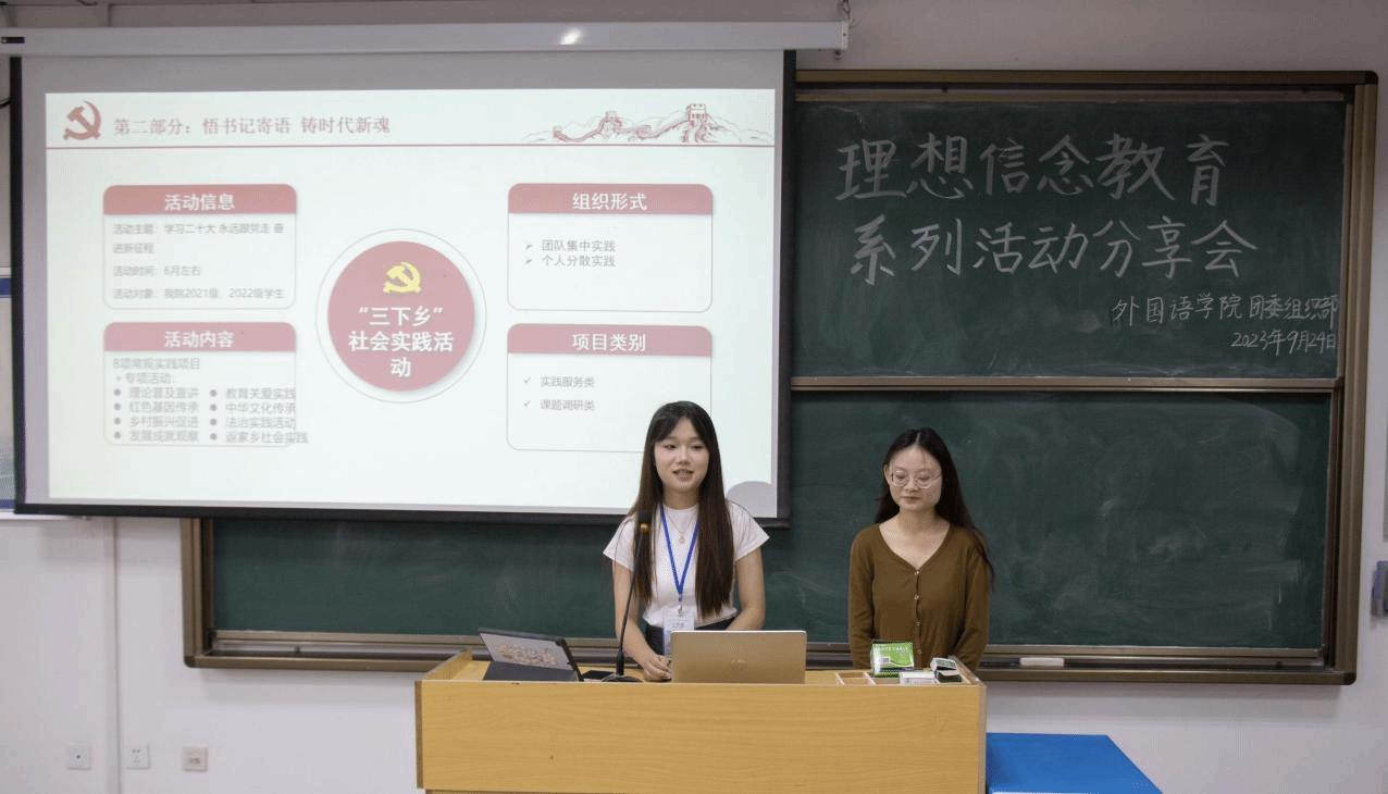 会上,安徽省“三下乡”少先队实践营专项立项负责同学为大家详细介绍了“三下乡”社会实践活动,就其活动内容、组织形式、项目类别等方面进行了详细阐明。现场气氛热烈,“我通过个人实践的方式与家乡社区进行对接,以七彩课堂的活动形式为社区儿童进行了为期二十天的教学实践。通过社会实践,我进一步坚定了理想信念,立志做有理想、敢担当、能吃苦、肯奋斗的新时代好青年。”2022级英语3班袁琦张帅就暑期社会实践活动与同学们进行了分享。会后,同学们纷纷表示未来要加强品德修养、不负时代、不负韶华。