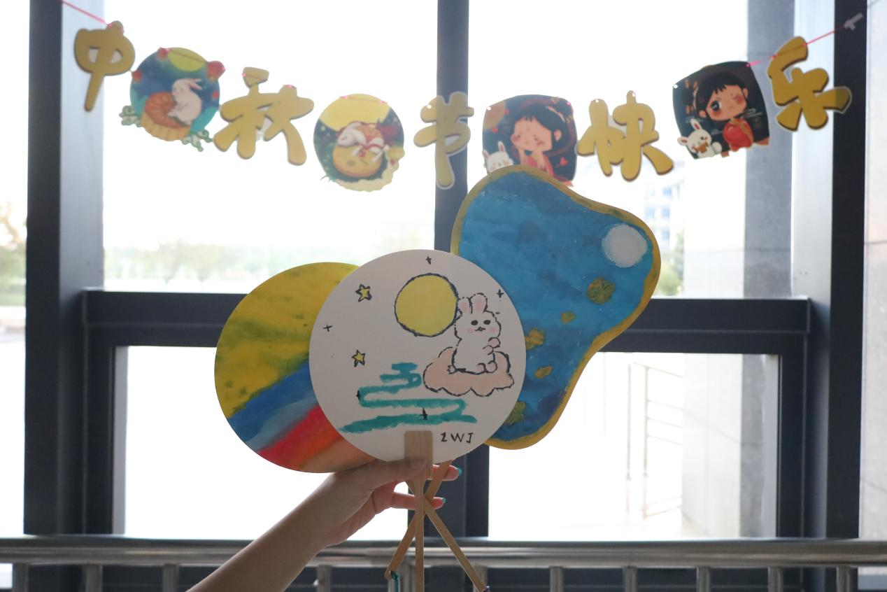 先将颜料挤入调色盘中备用,再把各色的颜料按比调配,最后用蘸有水粉颜料的笔尖在团扇上细细描绘……学生们手握画笔,经过约一个半小时的精心绘制,玉兔、月亮、桂花等元素跃然出现在团扇中,构成一幅幅“中秋佳景”。“玉兔抱着月亮,兔脚下是流淌的小溪。”外国语言文学类专业2024(7)班的张文静介绍着自己绘制的团扇。“中秋节自古以来就是阖家团圆的日子,恰巧碰上军训不能回家,只好把浓浓的思乡之情寄托于画中。”她说。