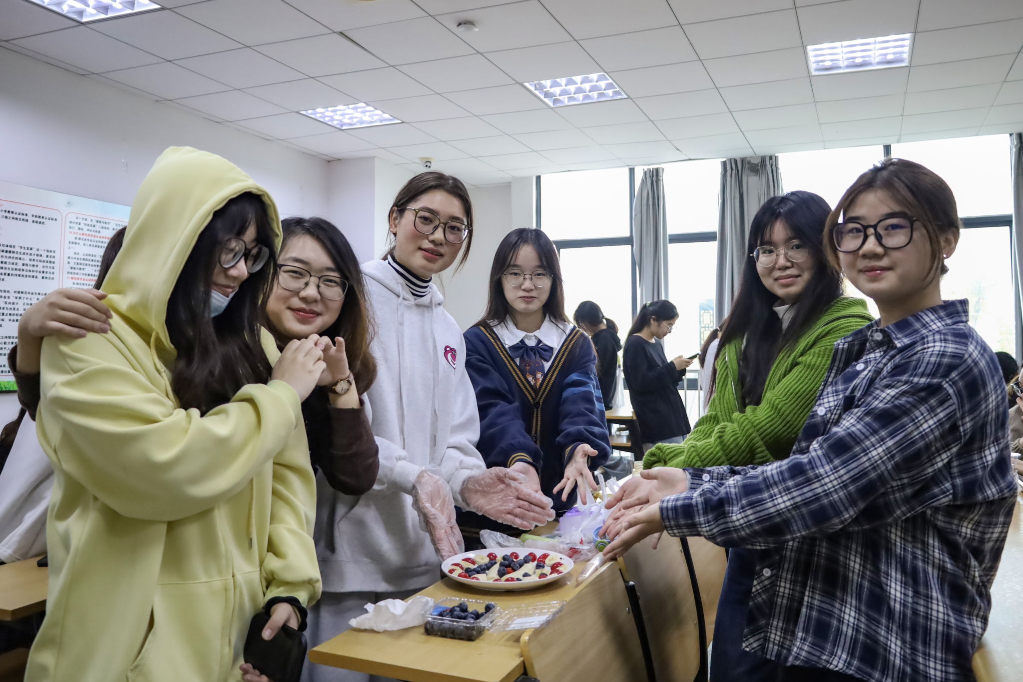 “每三到六人作为一组,每一组都有半个小时的准备时间,离终场十五分钟时,每五分钟,提醒一次。根据主题创意、整体造型、色彩花样、卫生处理四个方面对作品进行打分。”裁判宣布着规则。11月16日,beat365在线唯一官网在E104教室和E106教室举办创意水果拼盘比赛,150余名学生参与比赛。