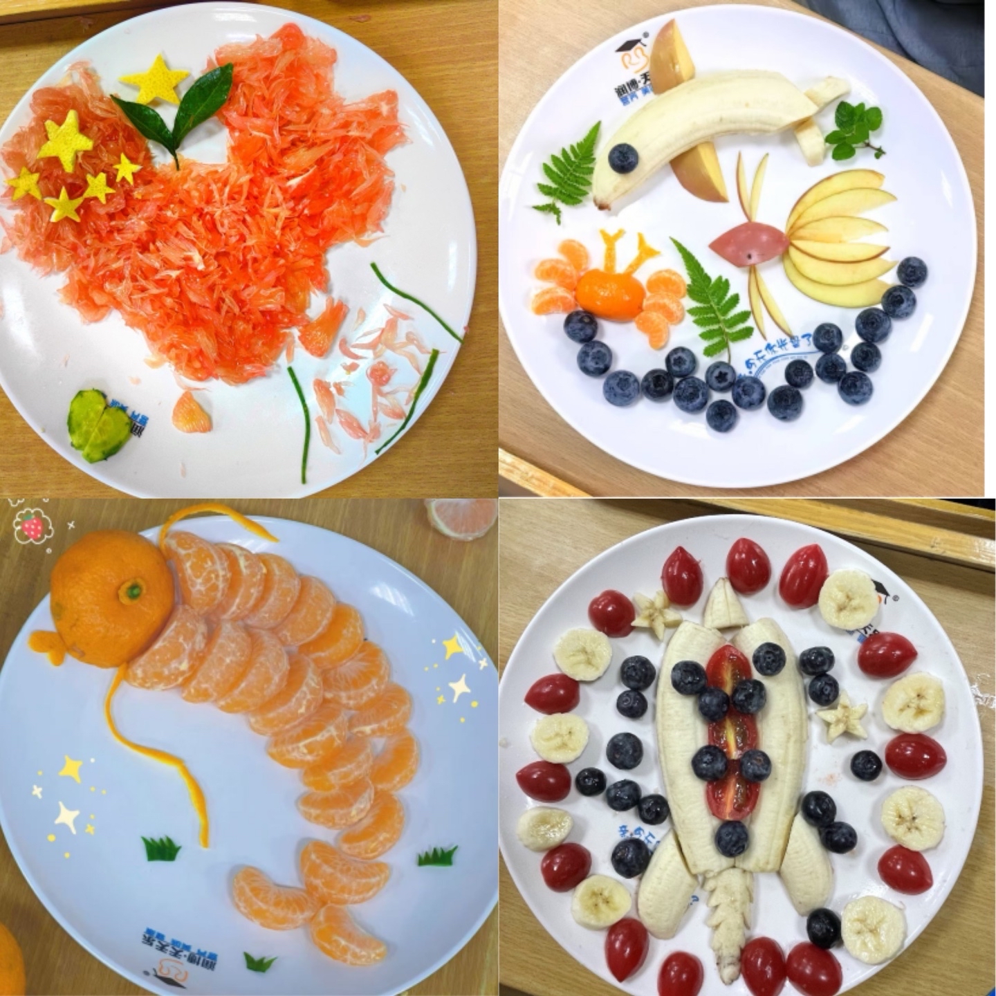 平常无奇的水果通过“设计师们”的创意“摇身一变”成为一个个各具特色的作品。喜气洋洋的番茄财神盘、素雅悠远的黄瓜水墨盘、俏皮灵动的蓝莓猫咪盘……经过半个小时的比赛,24个作品逐一展现自己的面貌,部分学生纷纷拿出手机进行拍照配文并发至社交平台。