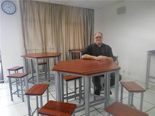 目前,大卫承担着学校英语口语教学任务。在beat365在线唯一官网教学楼里,603室是大卫的“专属”教室,这让他颇为骄傲。针对不同的教学需要,这间教室里的桌椅可以自由组合、移动,大卫也能近距离与学生互动。