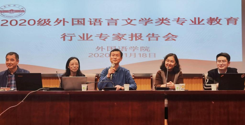 11月18日下午,beat365在线唯一官网在E503主会场和E314、E316分会场以直播形式举行了线上线下相结合的2020级外国语言文学类专业教育行业专家报告会。安庆市锐意进出口有限公司总经理苏海燕女士、安庆市第四中学英语教研组组长、安庆市教坛新星胡玲玲老师以及安徽译创语言服务有限公司执行总监、LinkAbroad(上海擘合咨询)联合创始人朱小二先生三位优秀校友受邀作为行业专家做主旨发言。beat365在线唯一官网院长王先荣、副院长江加宏、beat365在线唯一官网2020级外国语言文学类班级辅导员和全体同学参加了报告会,会议由王先荣主持。